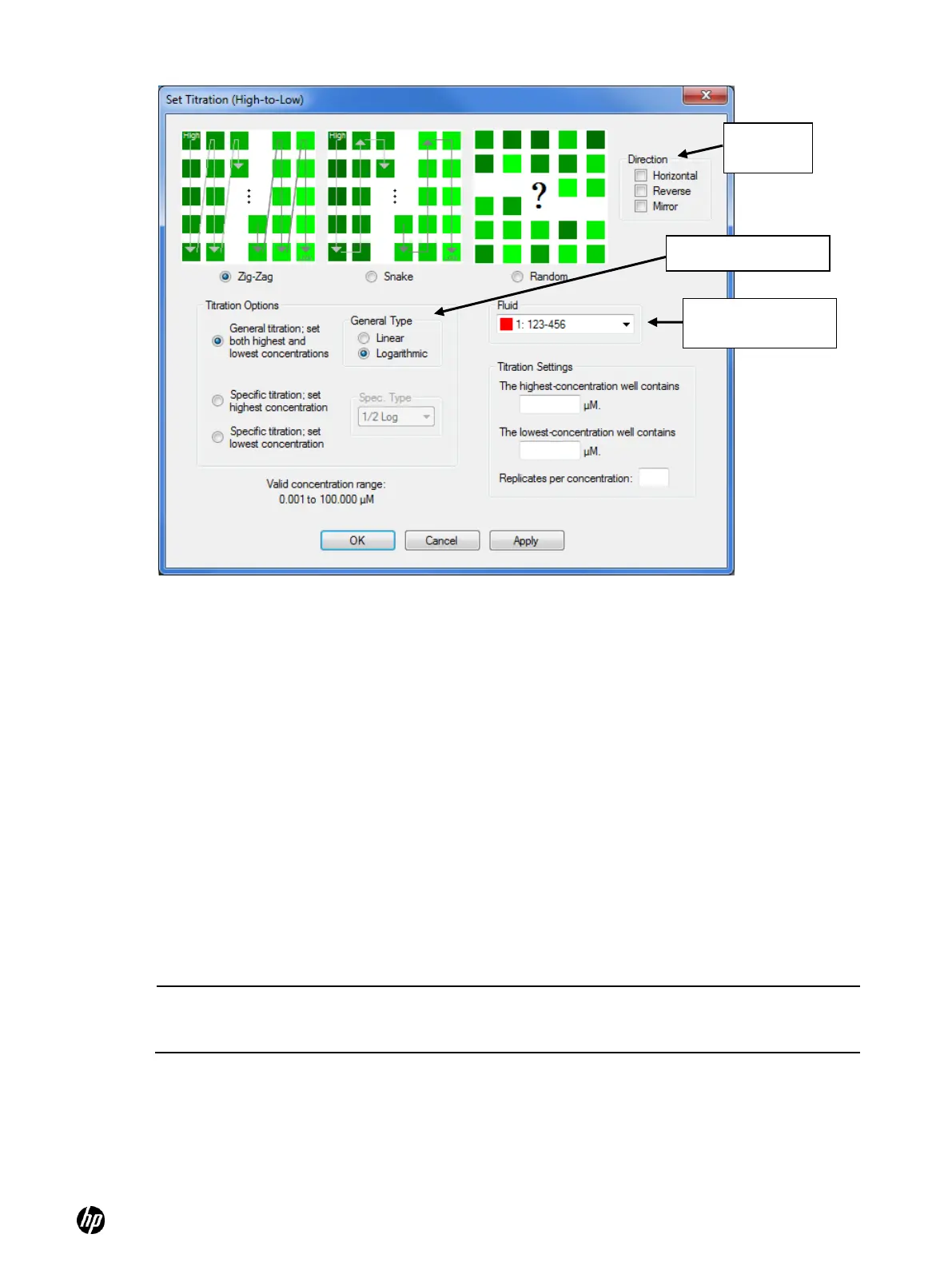 ○ General titration: you set both lowest and highest concentrations or volumes and let the