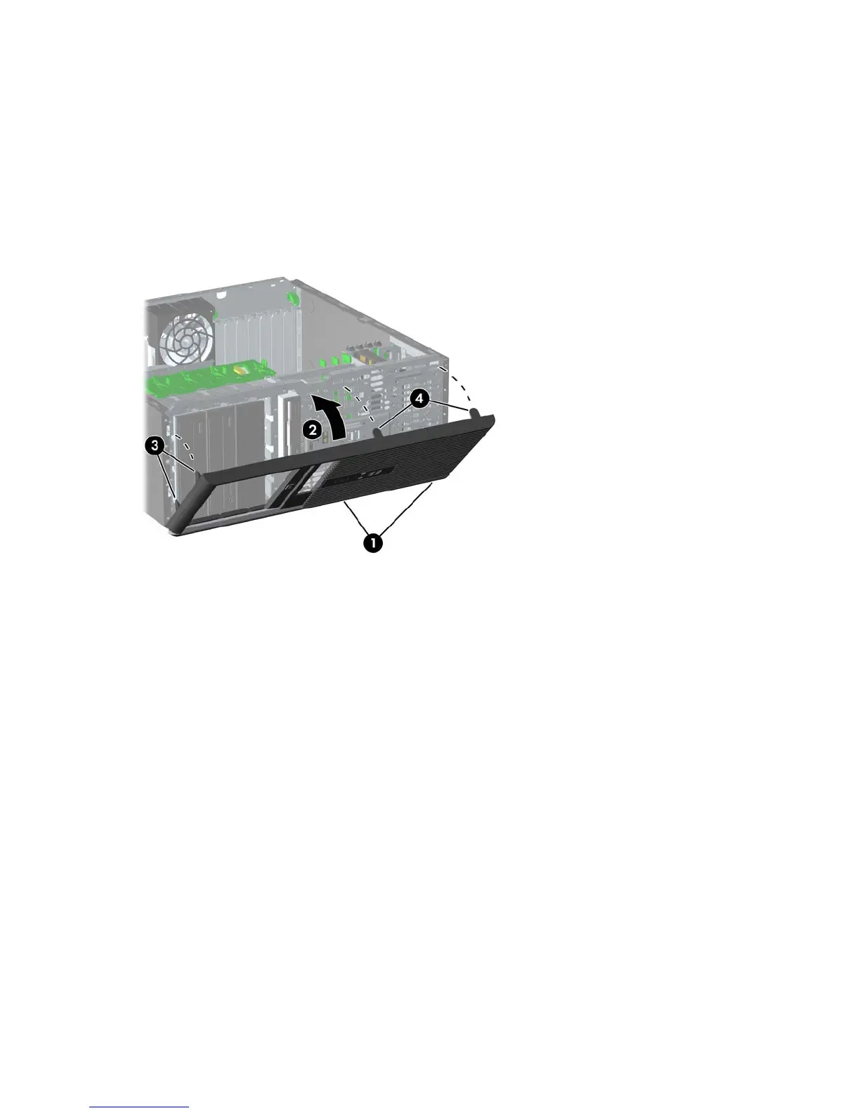 1. Place the bottom hinge points on the front bezel in their corresponding slots in the chassis (1).