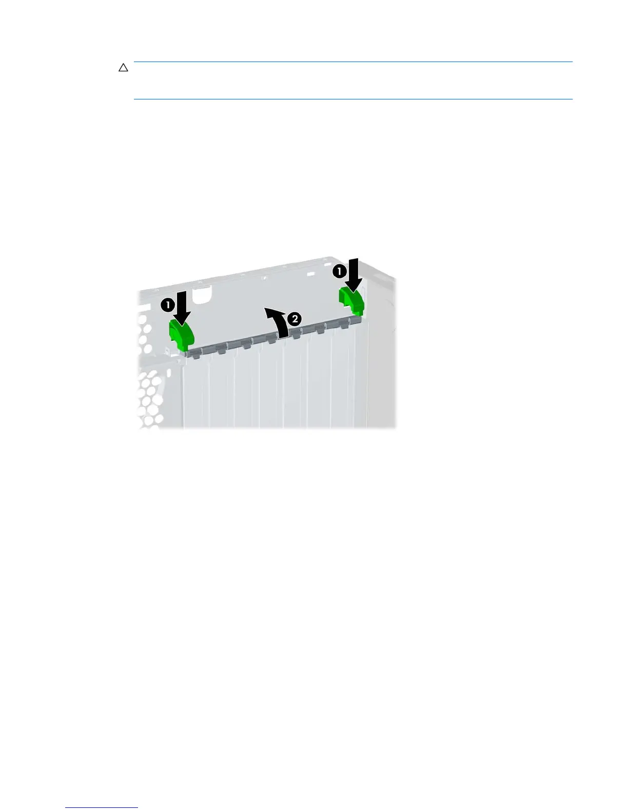 7. Press straight down on the two green thumb tabs inside the chassis (1) and rotate the expansion