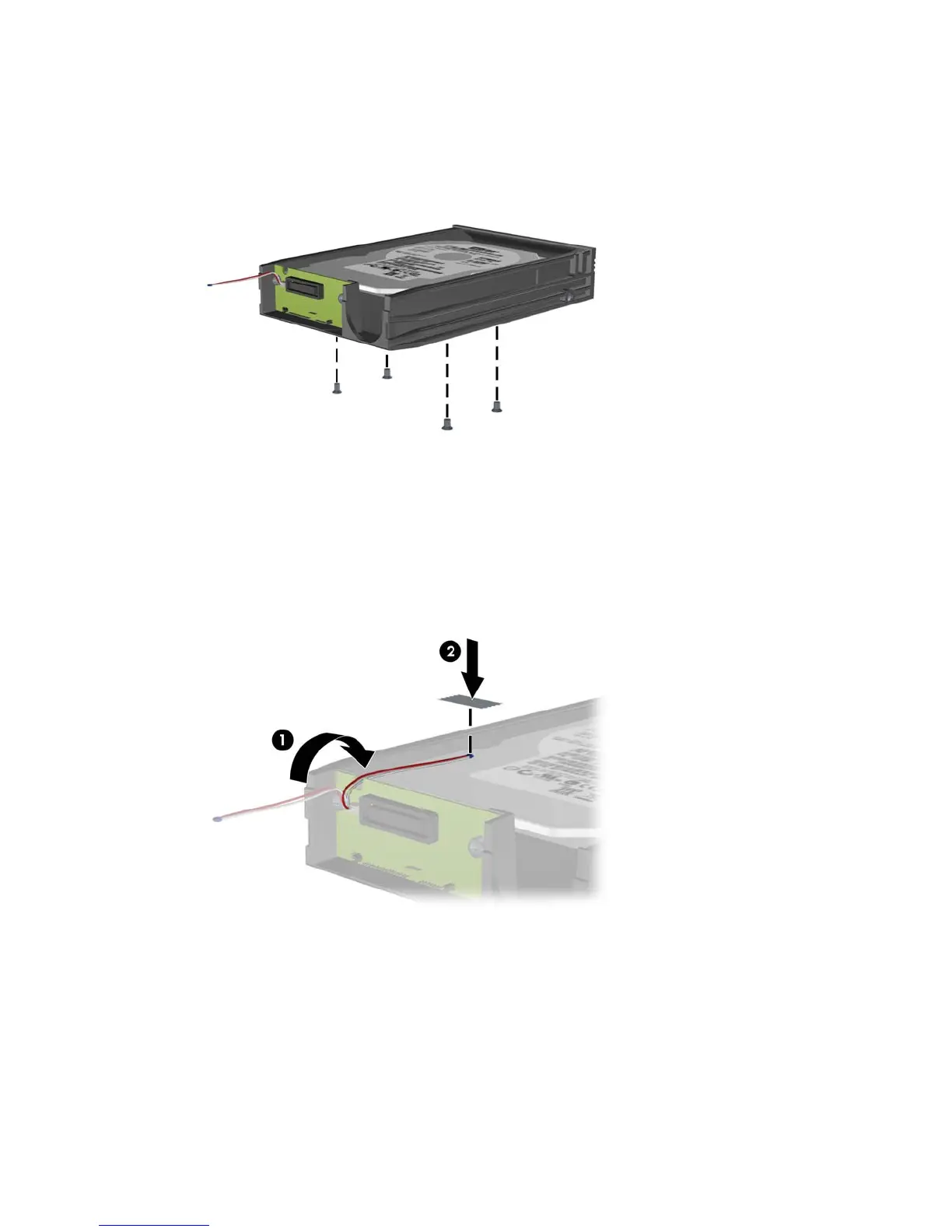 attach the thermal sensor to the top of the hard drive with the adhesive strip (2).