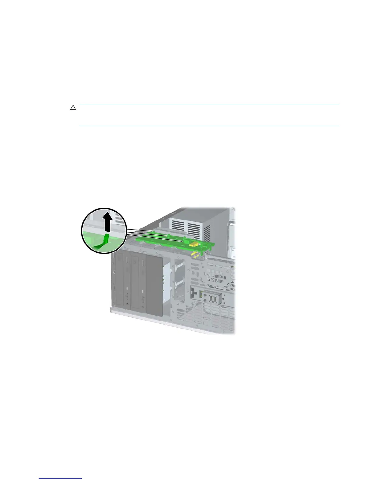 8. To release the drives from the 5.25-inch drive bay, lift the release tab on the green latch drive