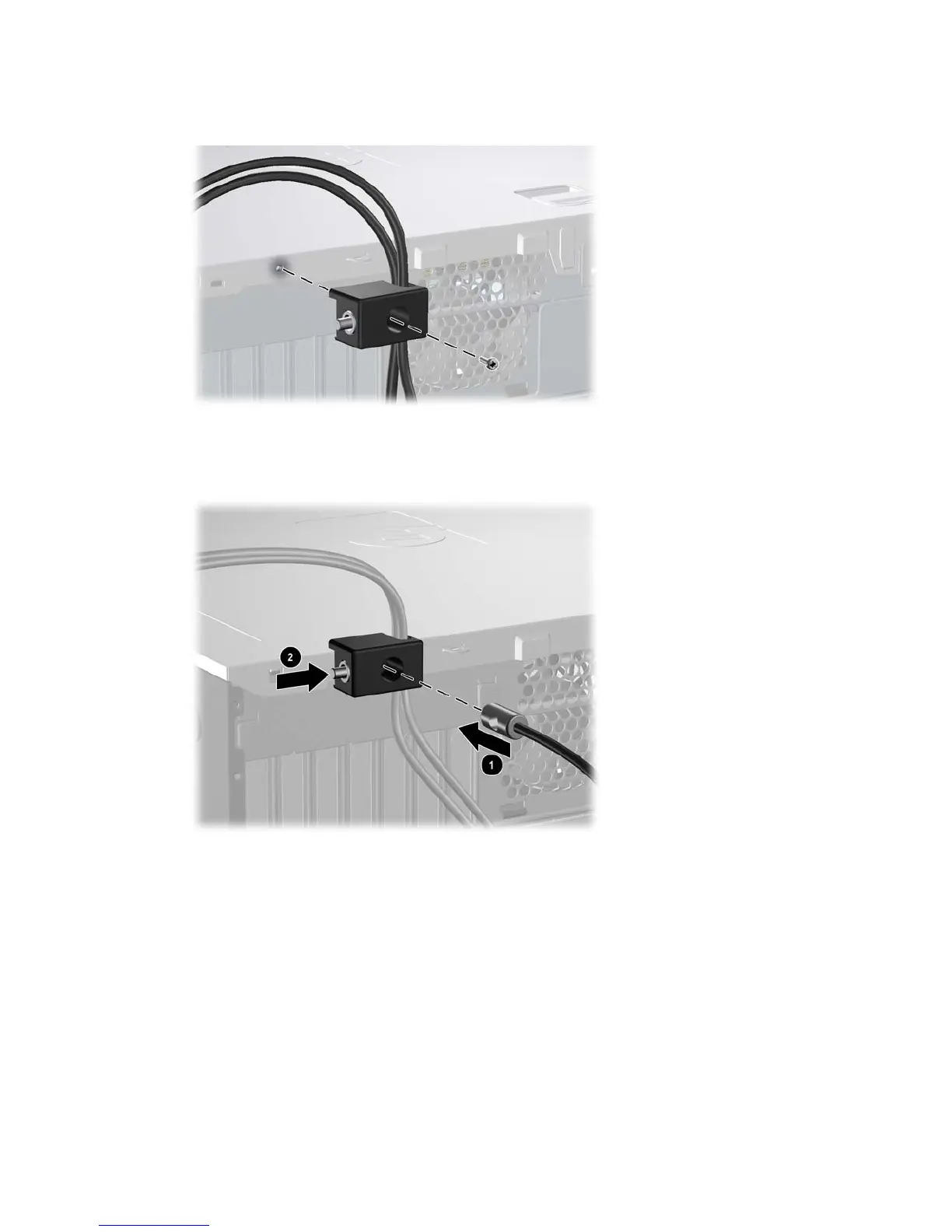 4. Insert the plug end of the security cable into the lock (1) and push the button in (2) to engage the