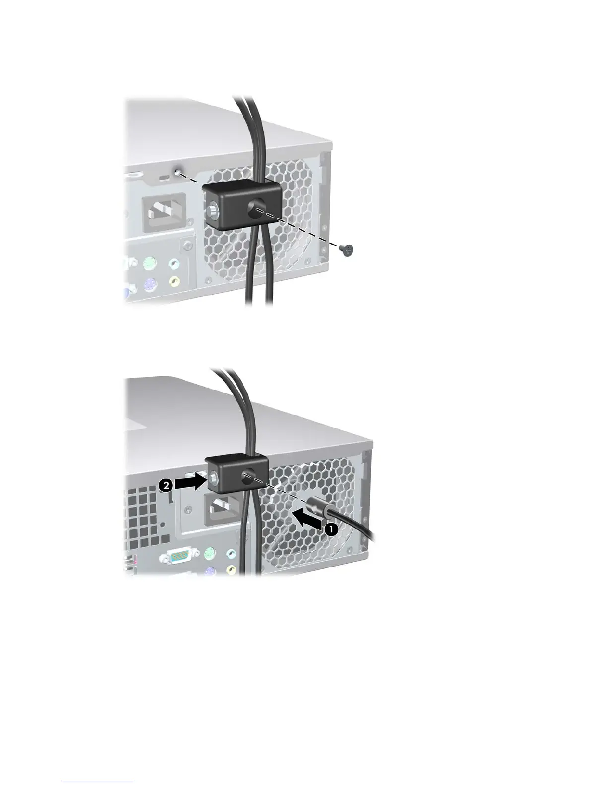 4. Insert the plug end of the security cable into the lock (1) and push the button in (2) to engage the