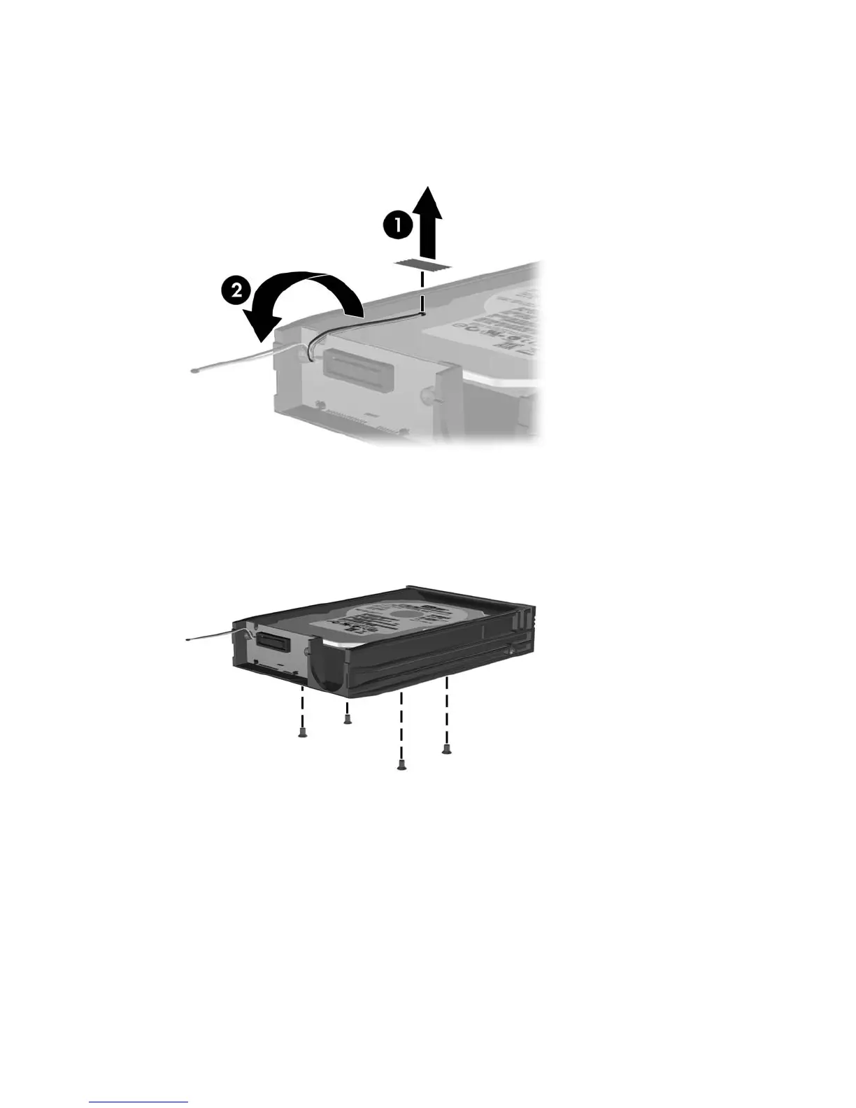 3. Remove the adhesive strip that secures the thermal sensor to the top of the hard drive (1) and