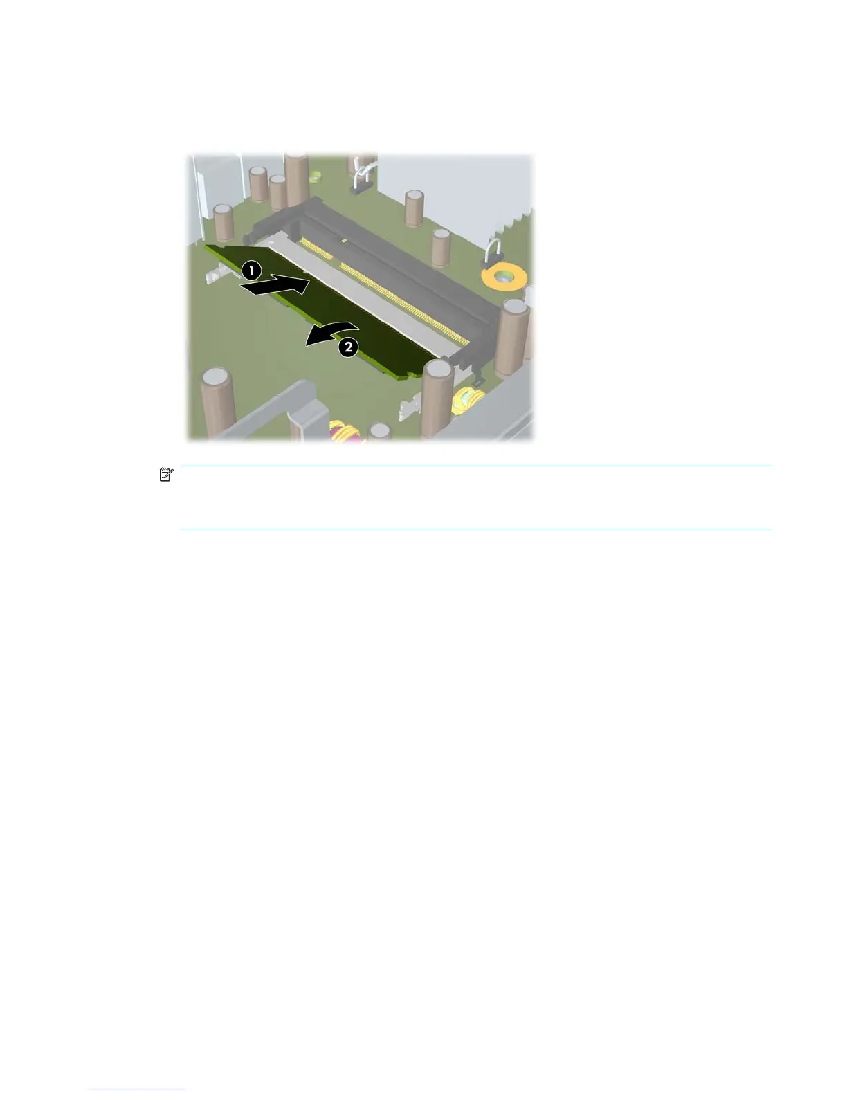 5. Slide the new SODIMM into the socket at approximately a 30° angle (1) then press the SODIMM