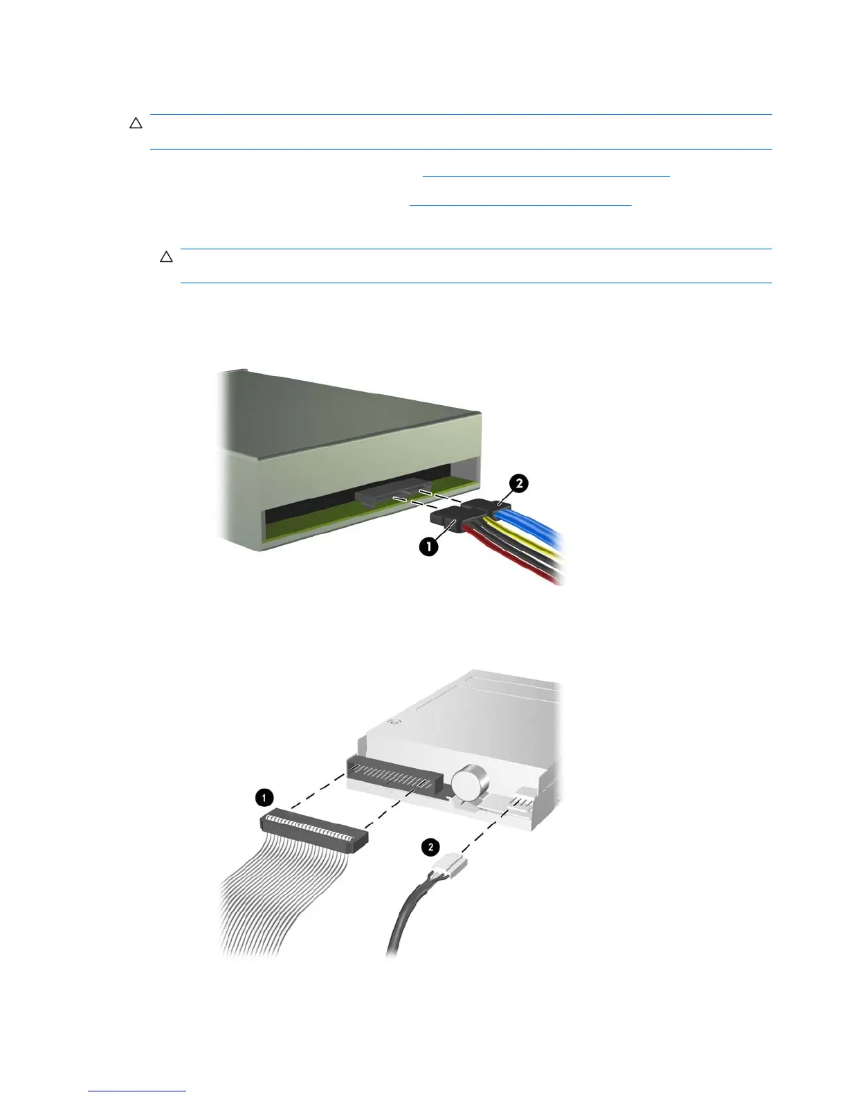 If you are removing an optical drive, disconnect the power cable (1) and data cable (2) from