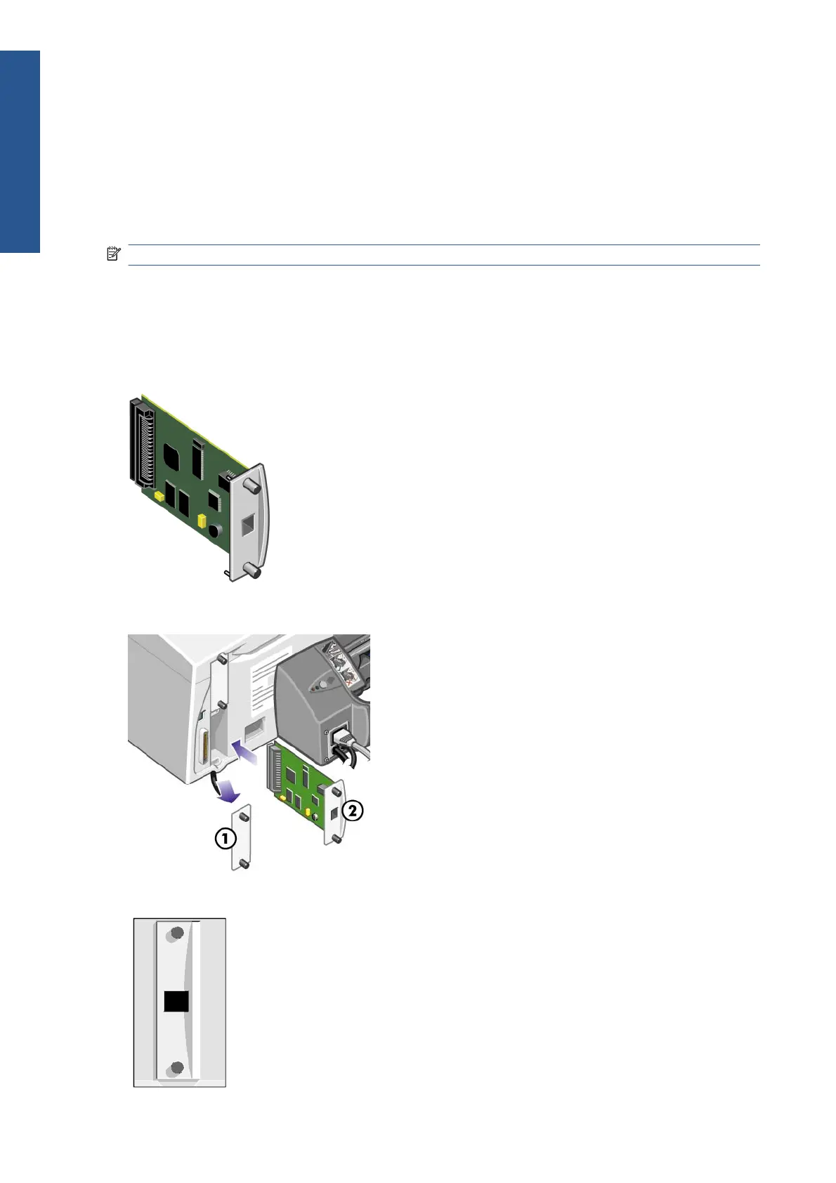 To install the card, first turn off and unplug the printer. Then remove the blank plate from the rear left