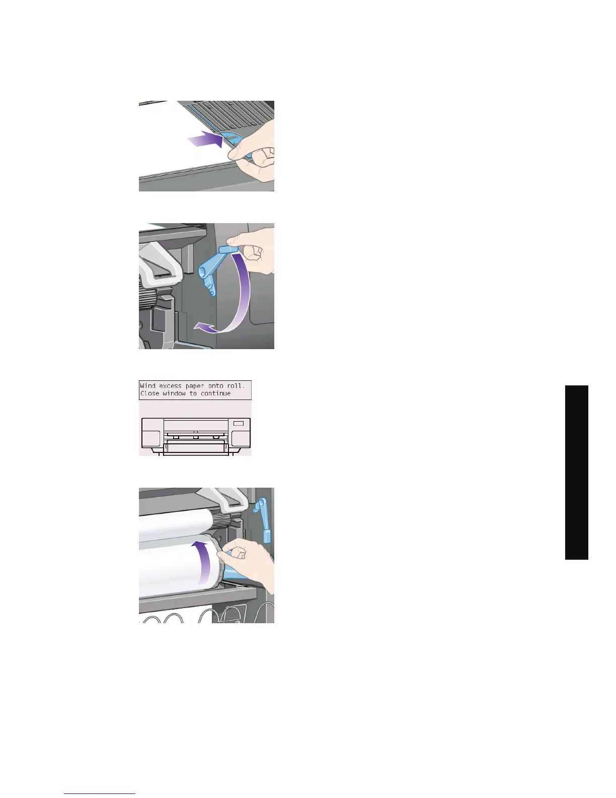 12. Wind the excess paper onto the roll. Use the paper stop to turn the roll in the direction shown.
