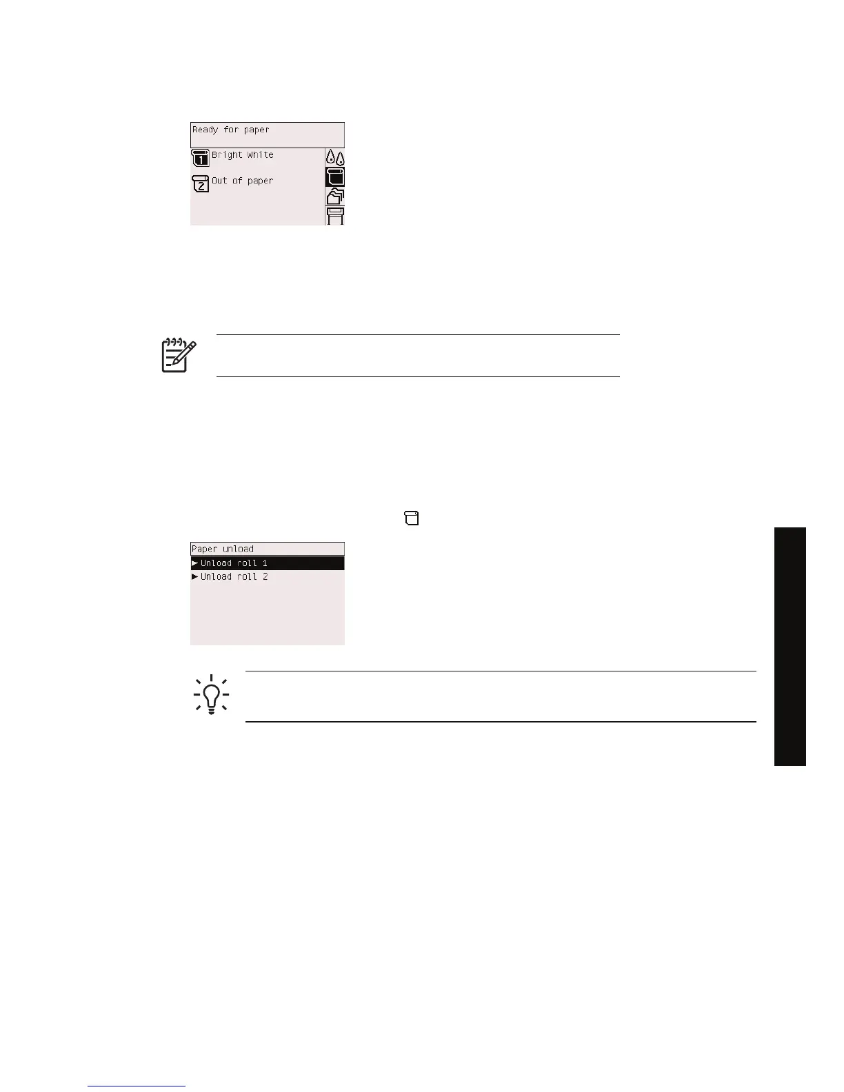 icon, then Paper unload > Unload roll 1 or Unload roll 2.