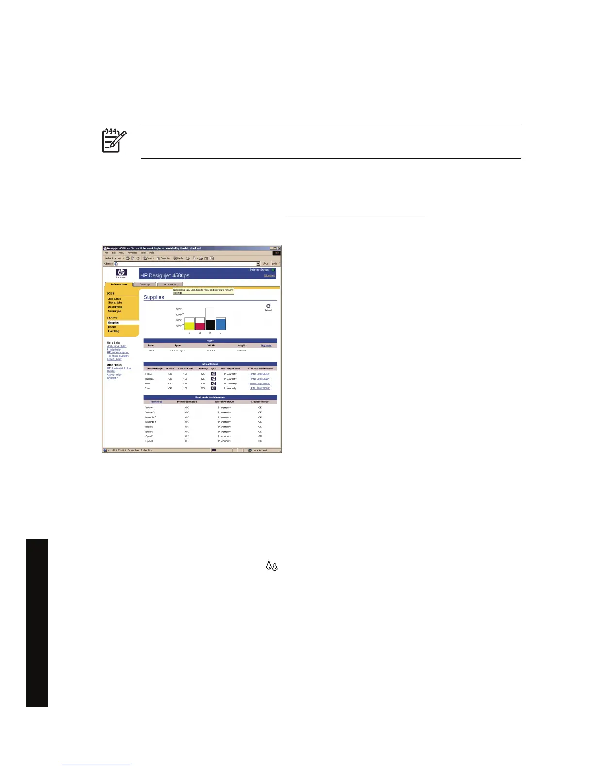 The Supplies page shows you the status of the ink cartridges (including the ink levels), the printheads,