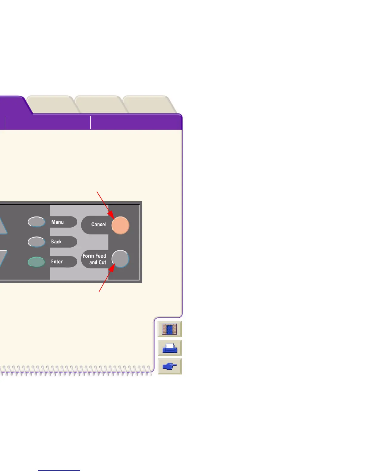 The Form Feed and Cut key causes a sheet to be ejected or the roll to be advanced and cut.