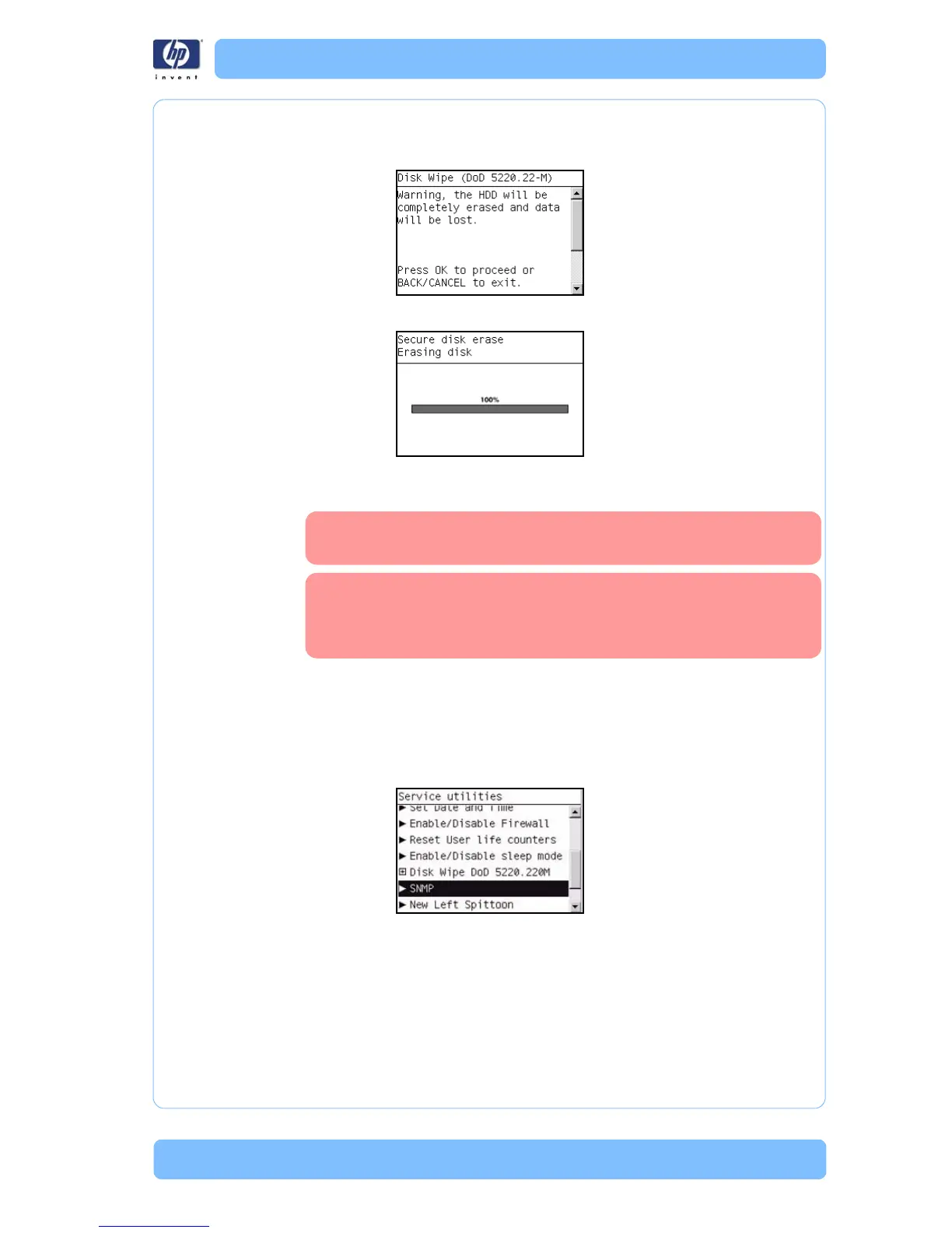 9 The printer reboots into the Disk Wipe mode, and continues with the disk