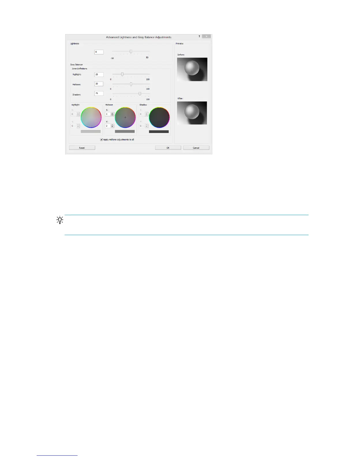The other controls for highlight, midtone and shadow can be used to adjust the gray balance of