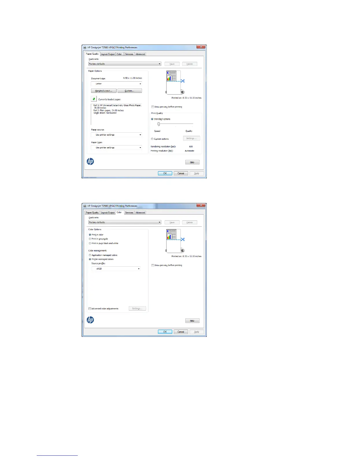 3. You may wish to change the default paper source, paper type, and print quality.