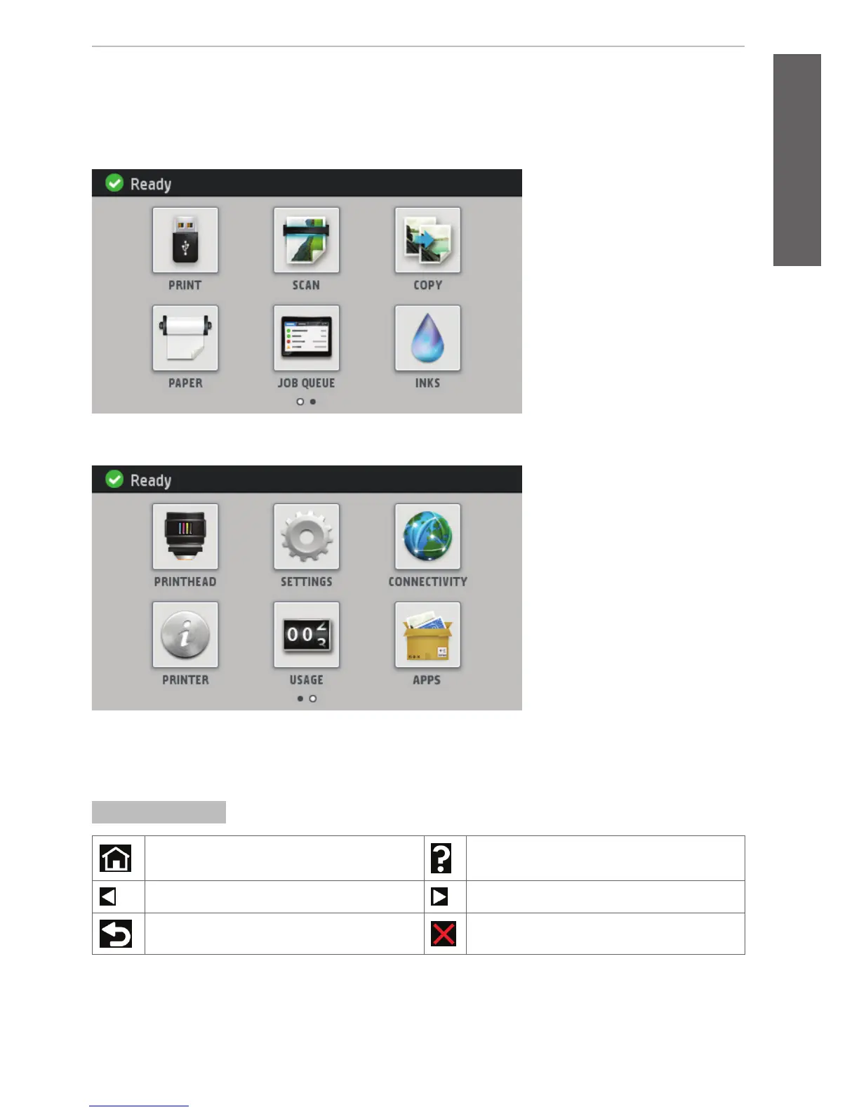 ホーム画面は2ページあり、さまざまな操作とオプションを選択できます。2ページ目にアクセスするには、