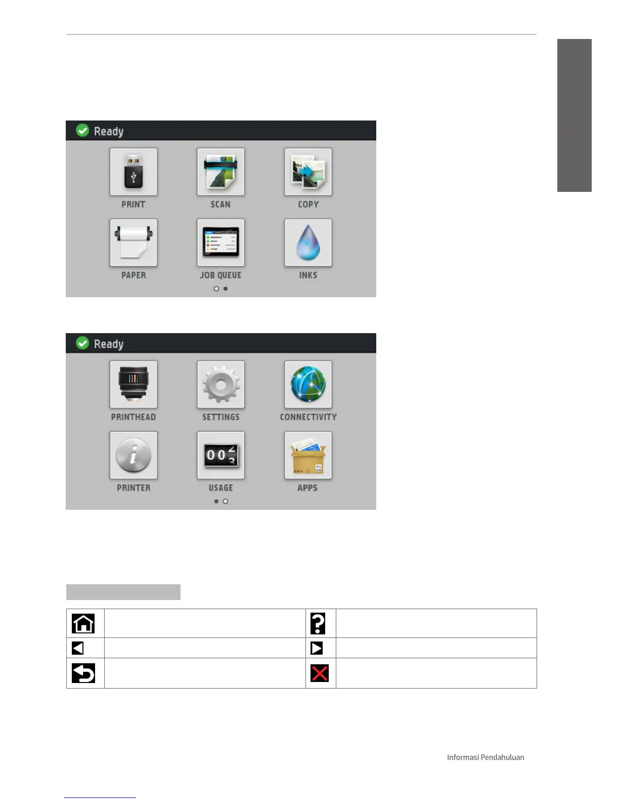 pengaturan cetak/pindai/salin, menjalankan kalibrasi dan pengujian, dan banyak lagi. Panel depan juga menampilkan