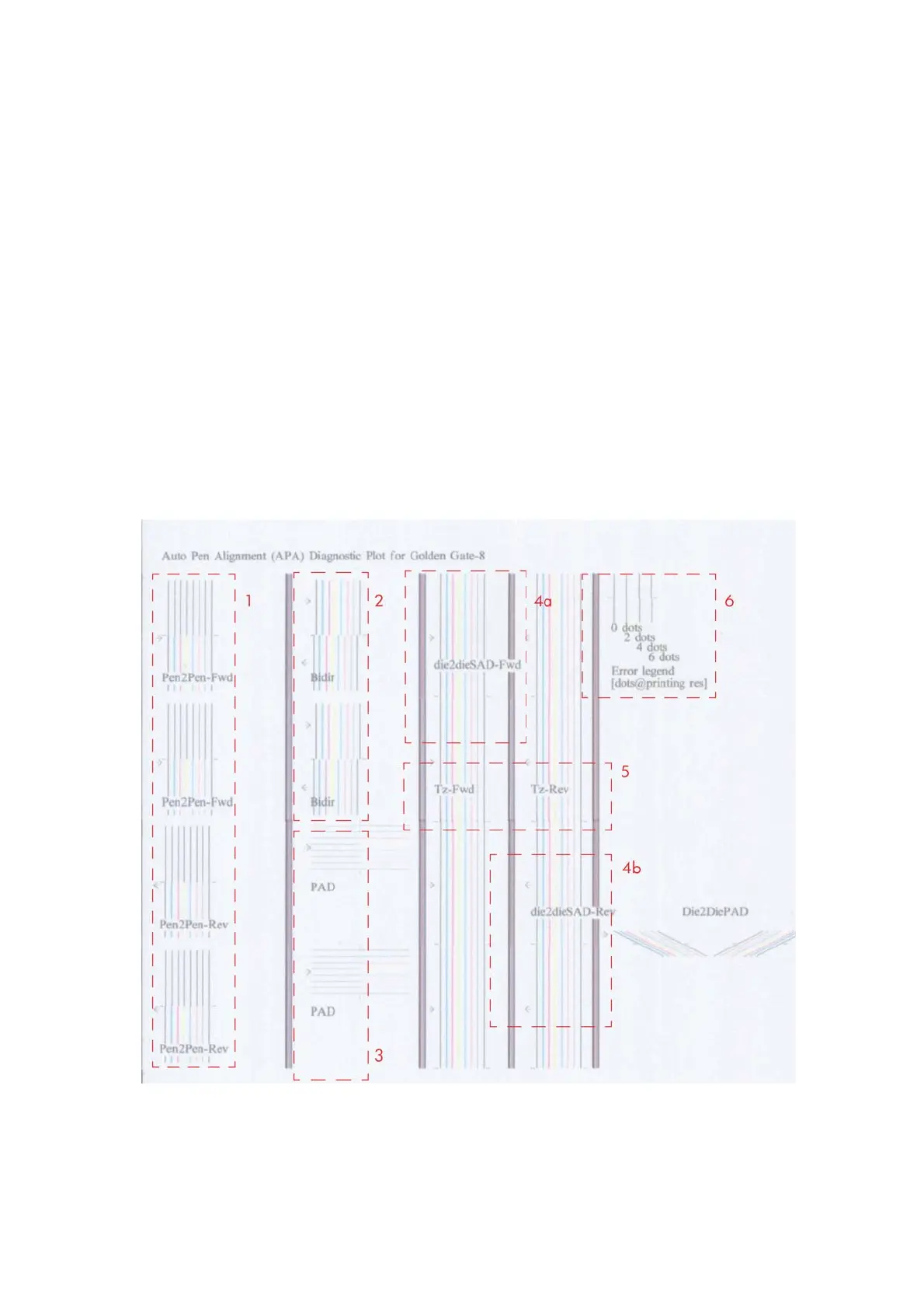 4. The alignment in scan axis direction between both printhead of the same color is marked as 4a (in