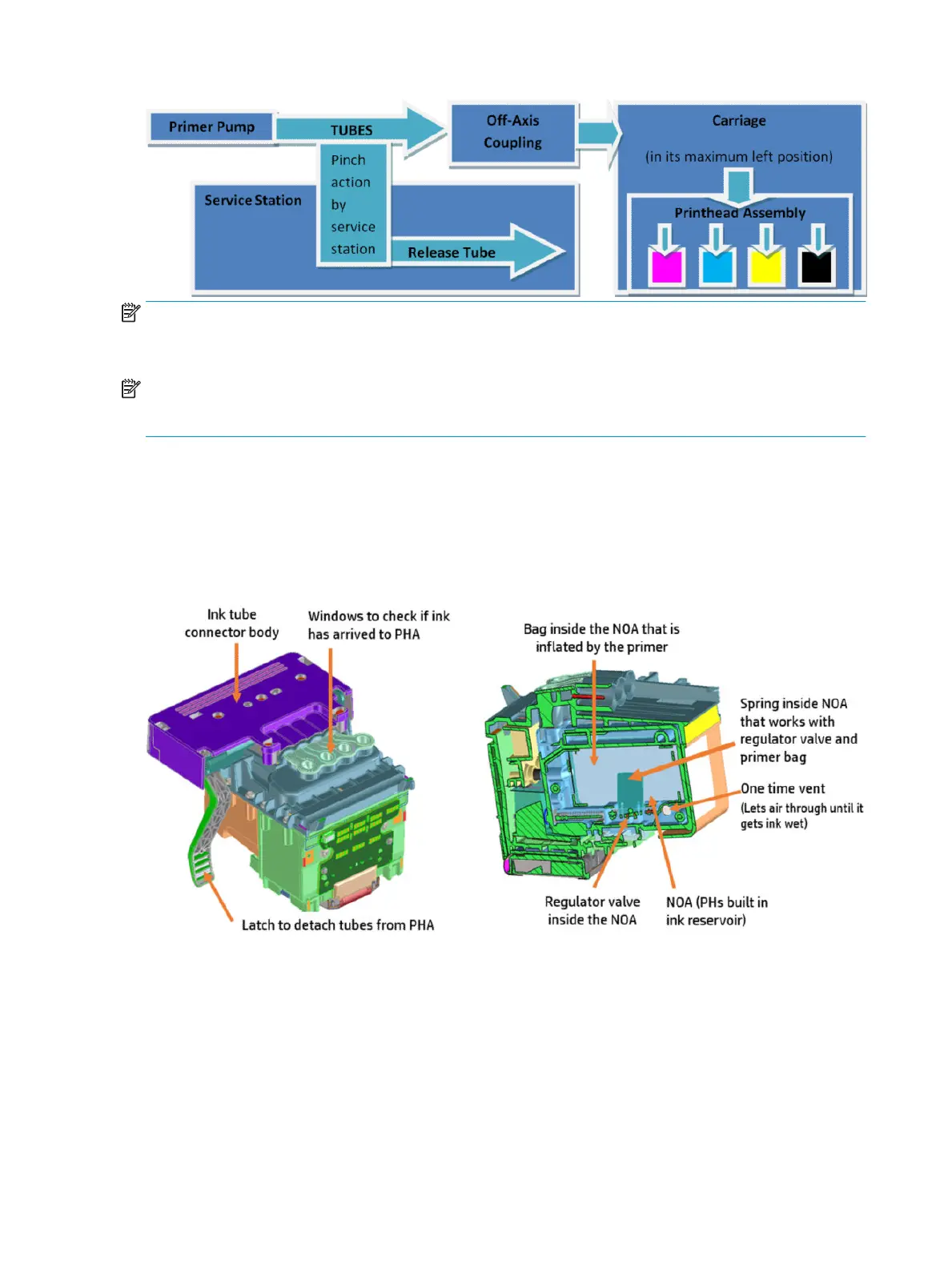 The printhead operates as a full assembly, regulating ink ow in the NOA regulator, and warehousing air