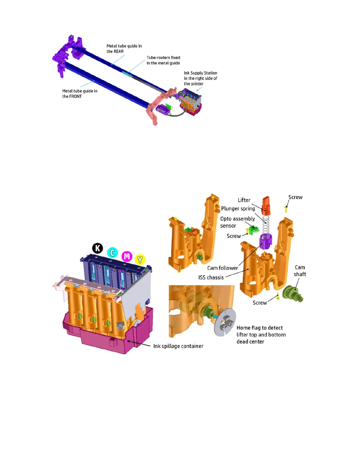 The ISS is mounted on the right of the printer so as to pump ink from the supplies to the PHA. Several of their