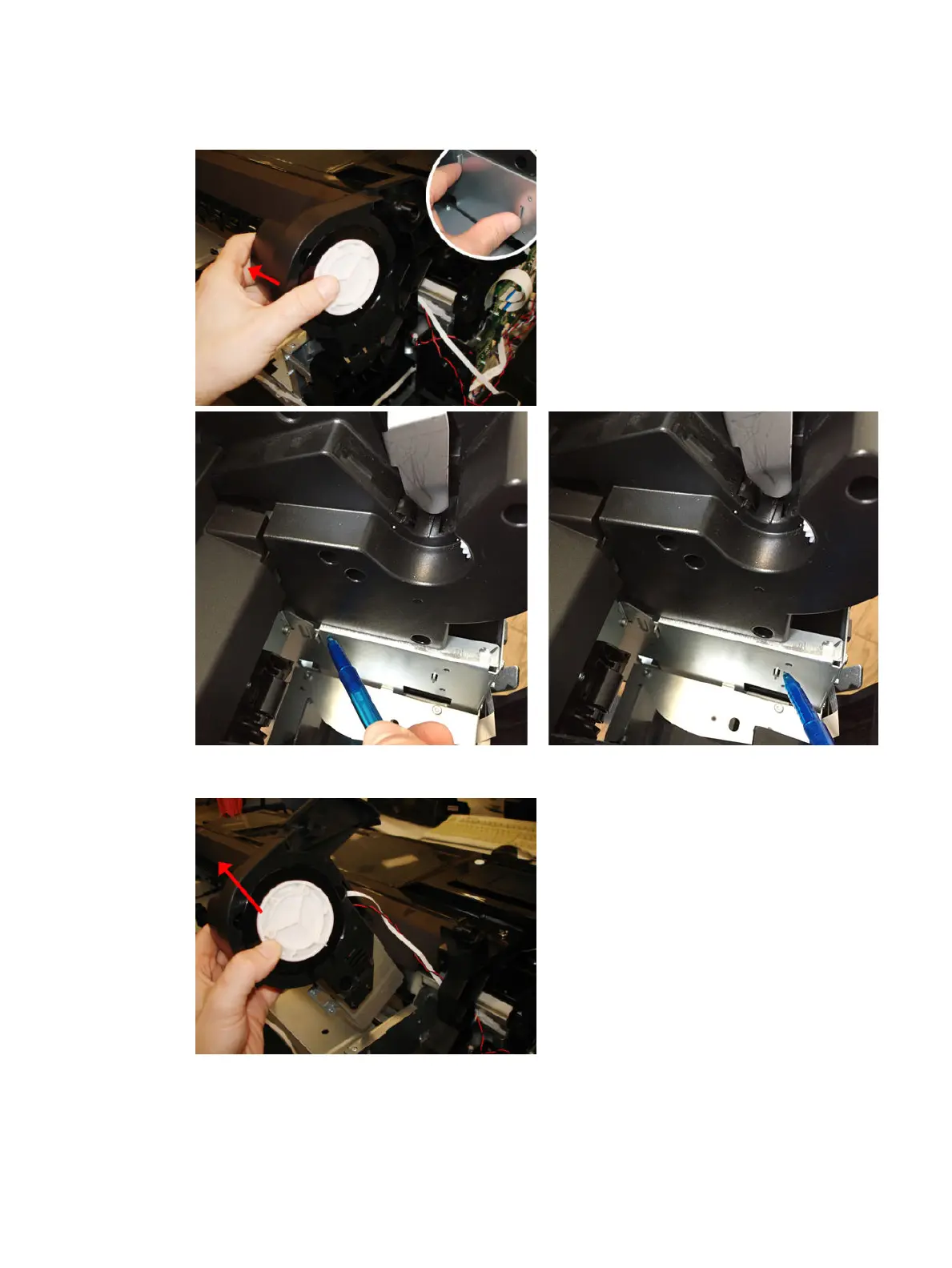 17. From the rear of the machine, rotate the Left Roll Support lower metal lugs a little to the right to detach