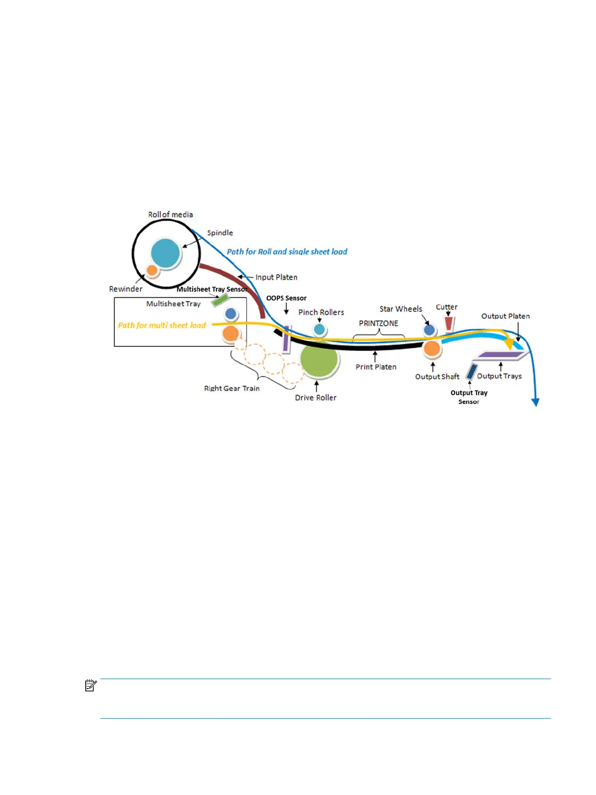 The paper passes from its source (Roll, Single Tray, or Multi-Sheet Tray) until it touches the Out-Of-Paper