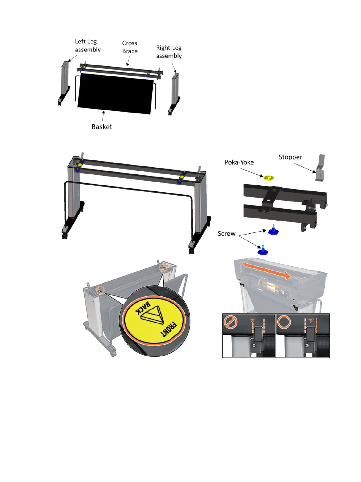 In order to make the assembly easier the stand has poka yoke features (yellow caps), and some guiding