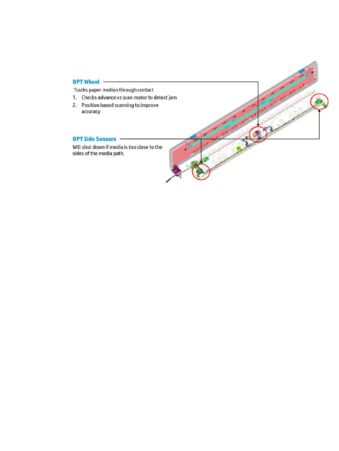 An idle wheel with encoder (OPT wheel), propelled by the media, gives advance information on