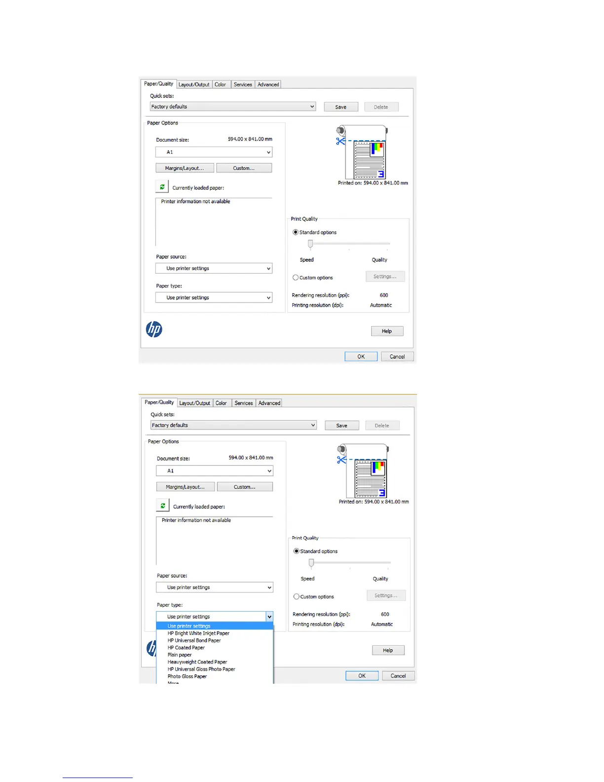 7. In the Paper/Quality tab, select the paper type that you intend to use.