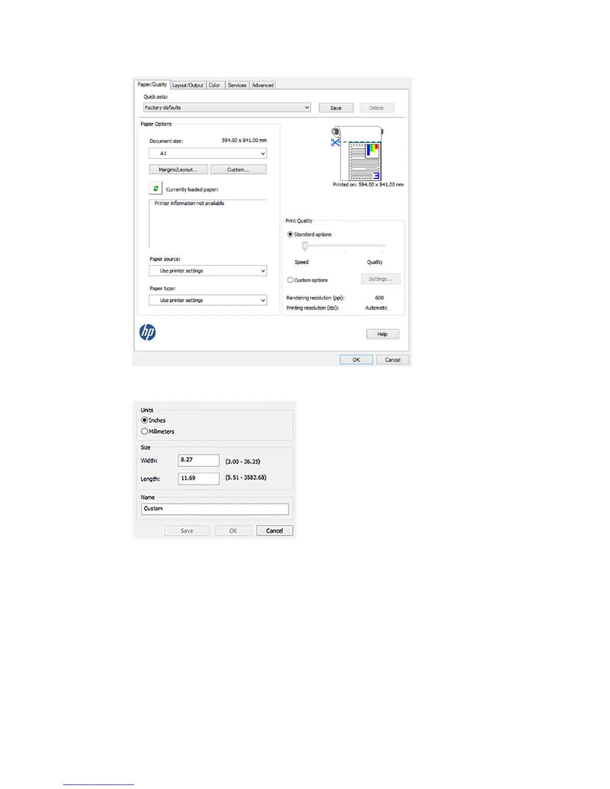 length and the name of your custom paper size. Press the Save and OK buttons.