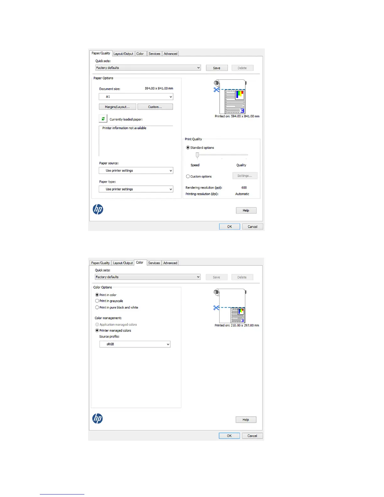 4. In the Color tab, the default color management option is Printer managed colors, and this is the correct
