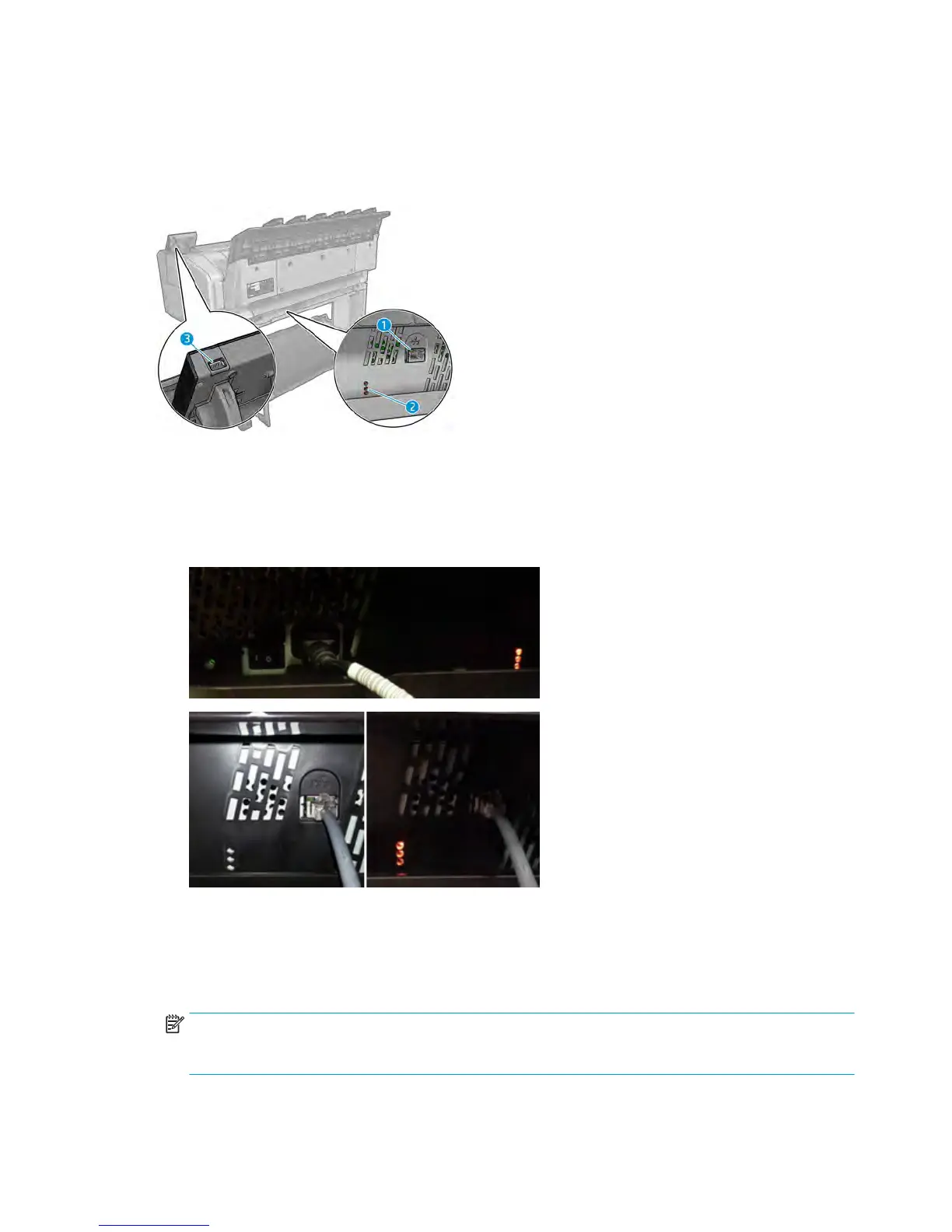 The LEDs of the formatter (visible at the rear of the printer, see figure number 2 below), the power supply,