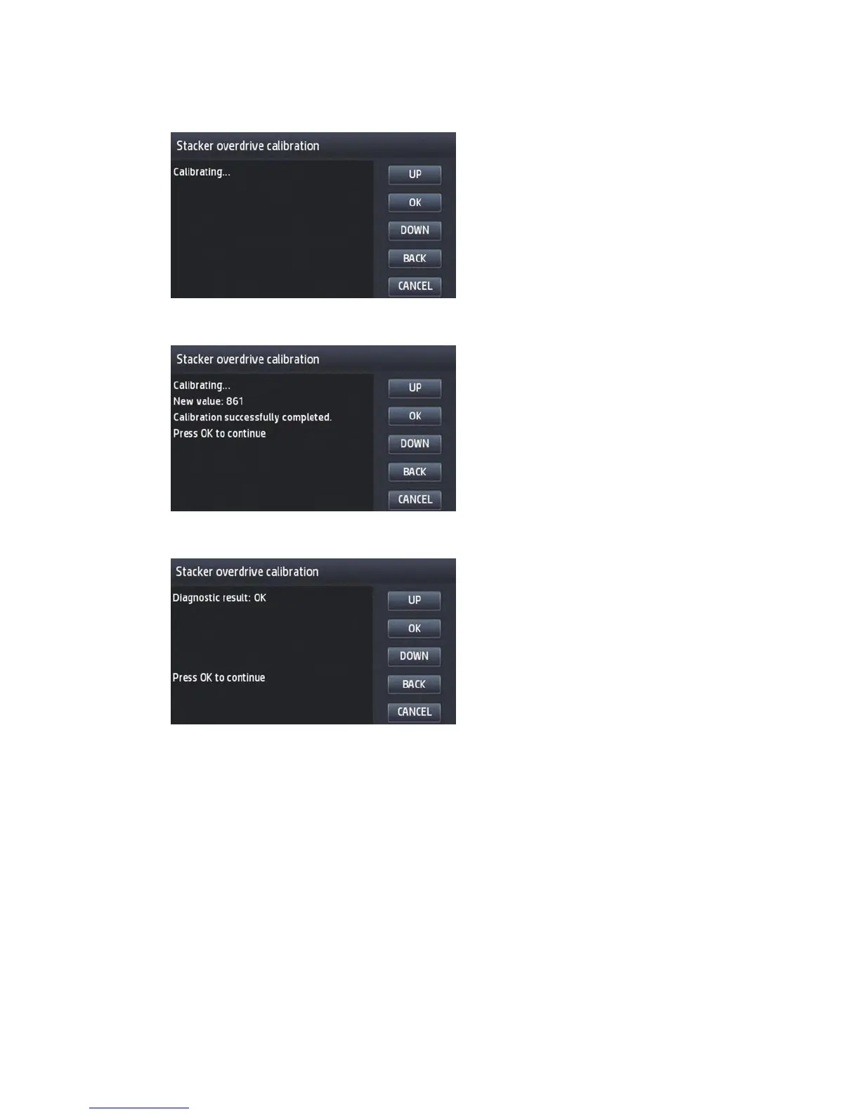4. The screen will show 'calibrating status' during some minutes while the stacker overdrive is moving at
