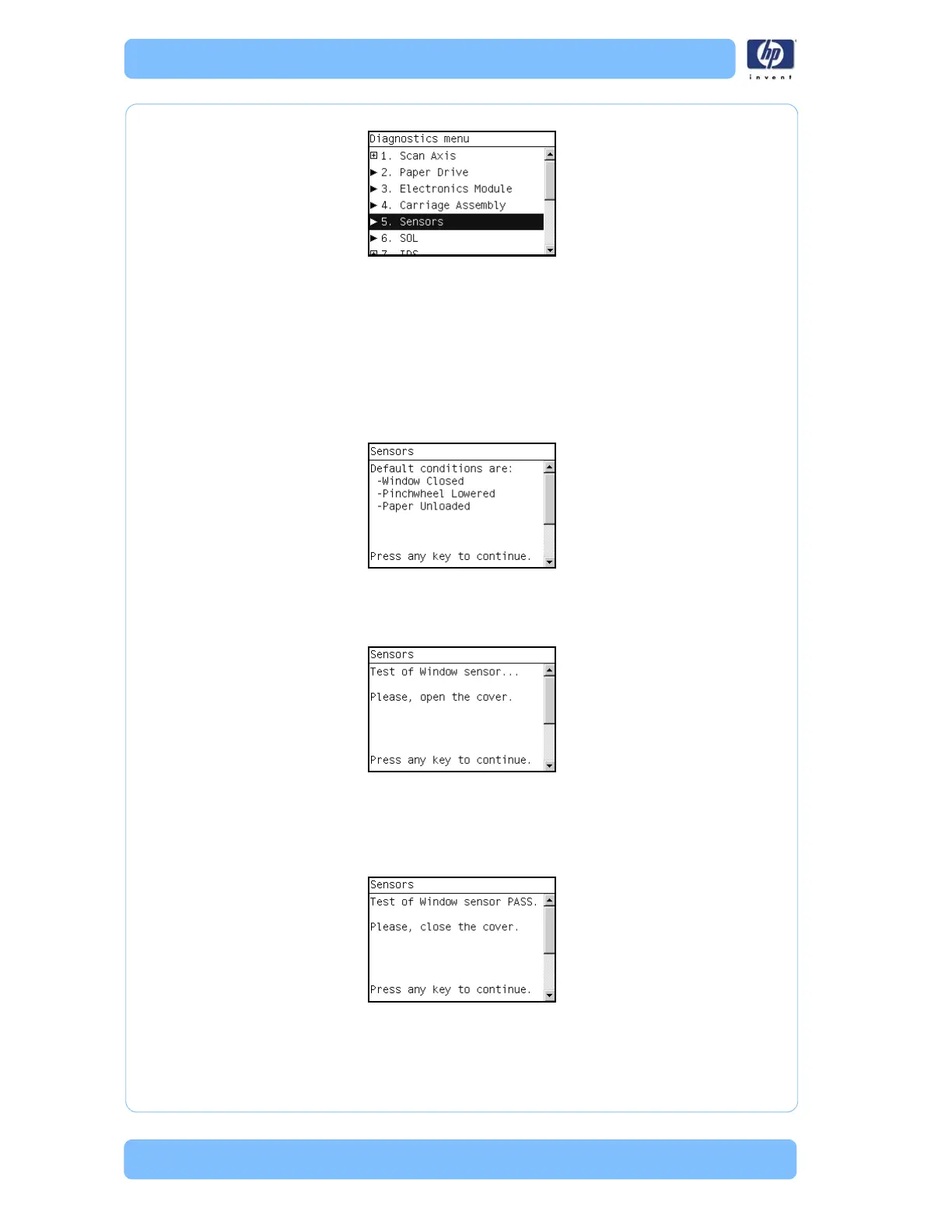 5 The Window sensor test starts and the Front Panel prompts you to open the