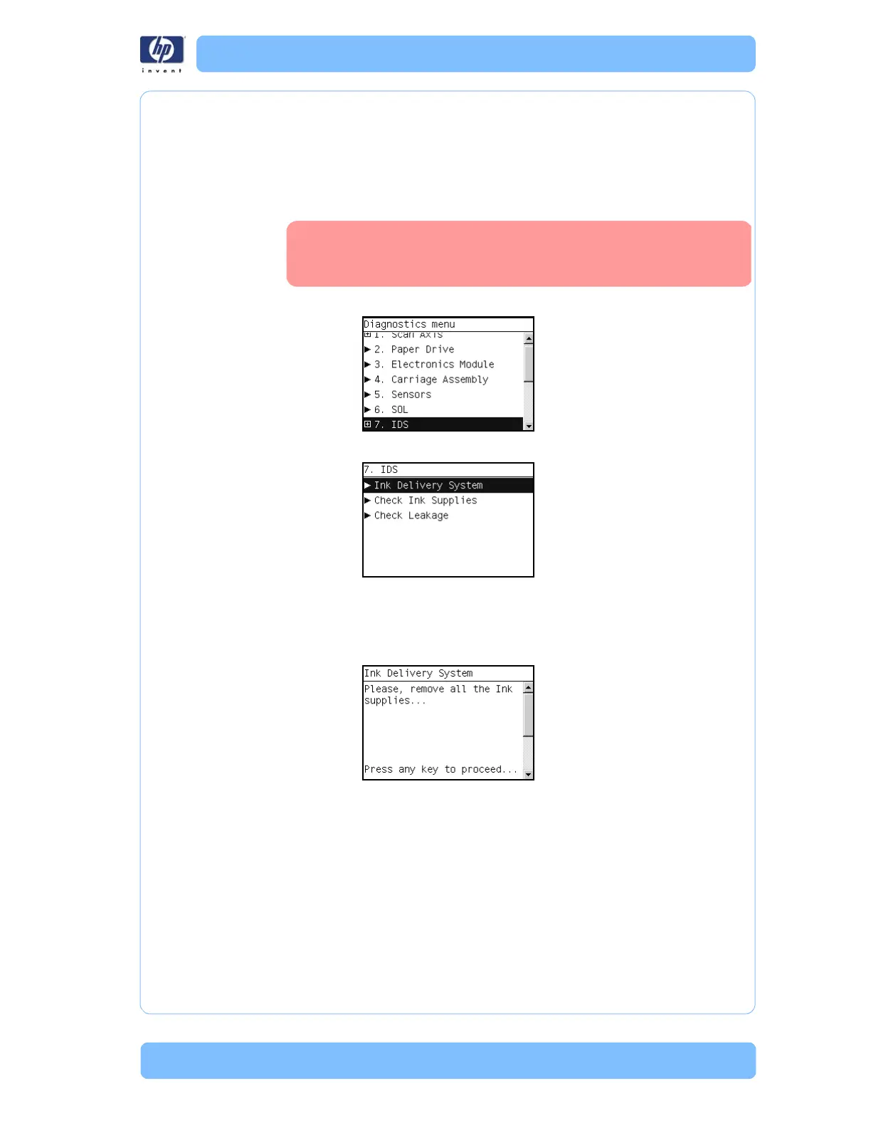 4 The Ink Delivery System test starts and the front Panel prompts you to remove