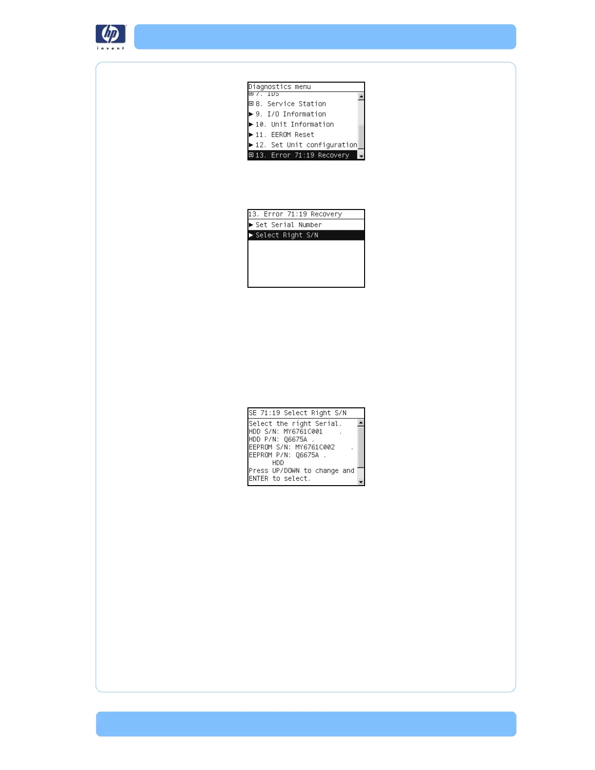 3 In the 13. Error 71:19 Recovery submenu, scroll to Select Right S/N
