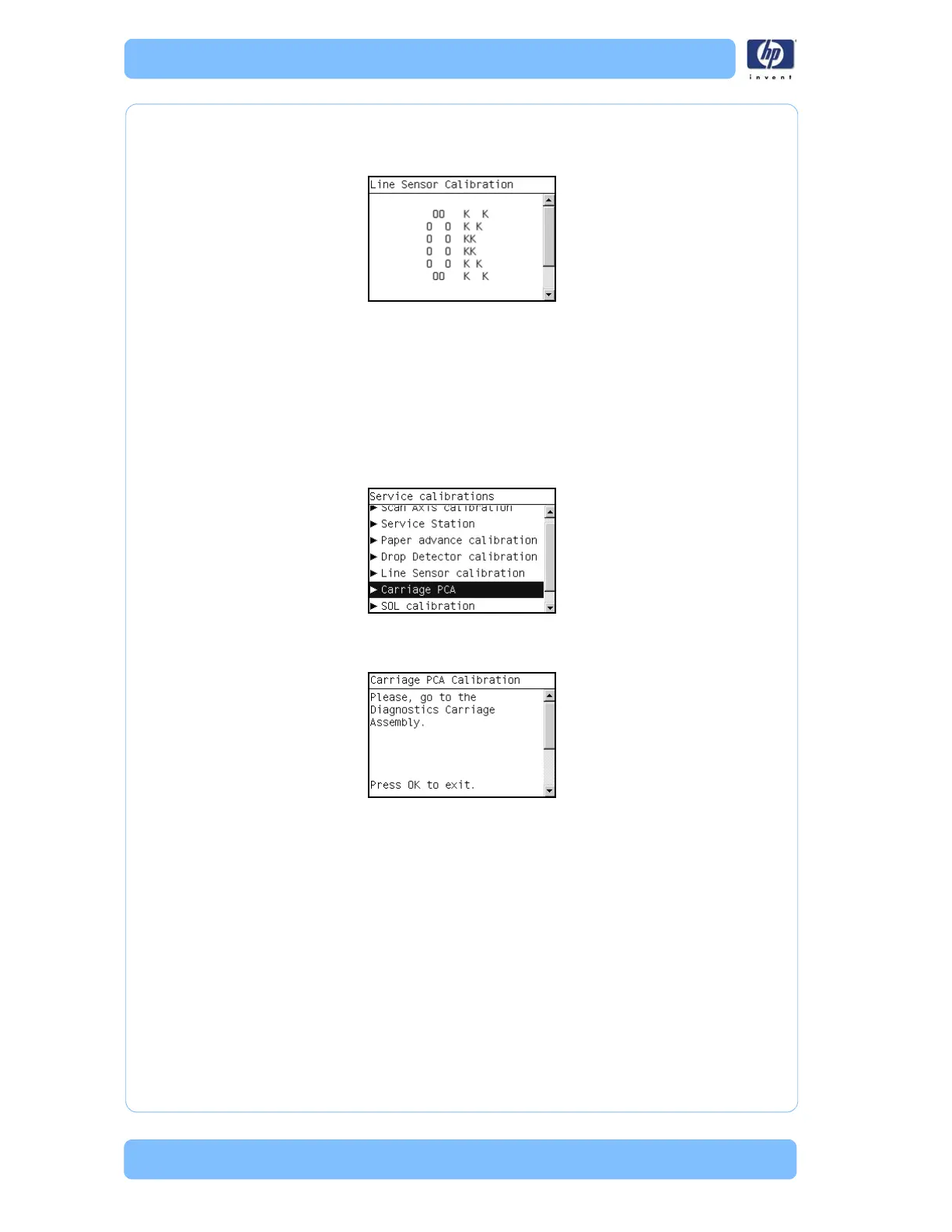 1 In the Service Calibrations submenu, scroll to Carriage PCA and press OK.