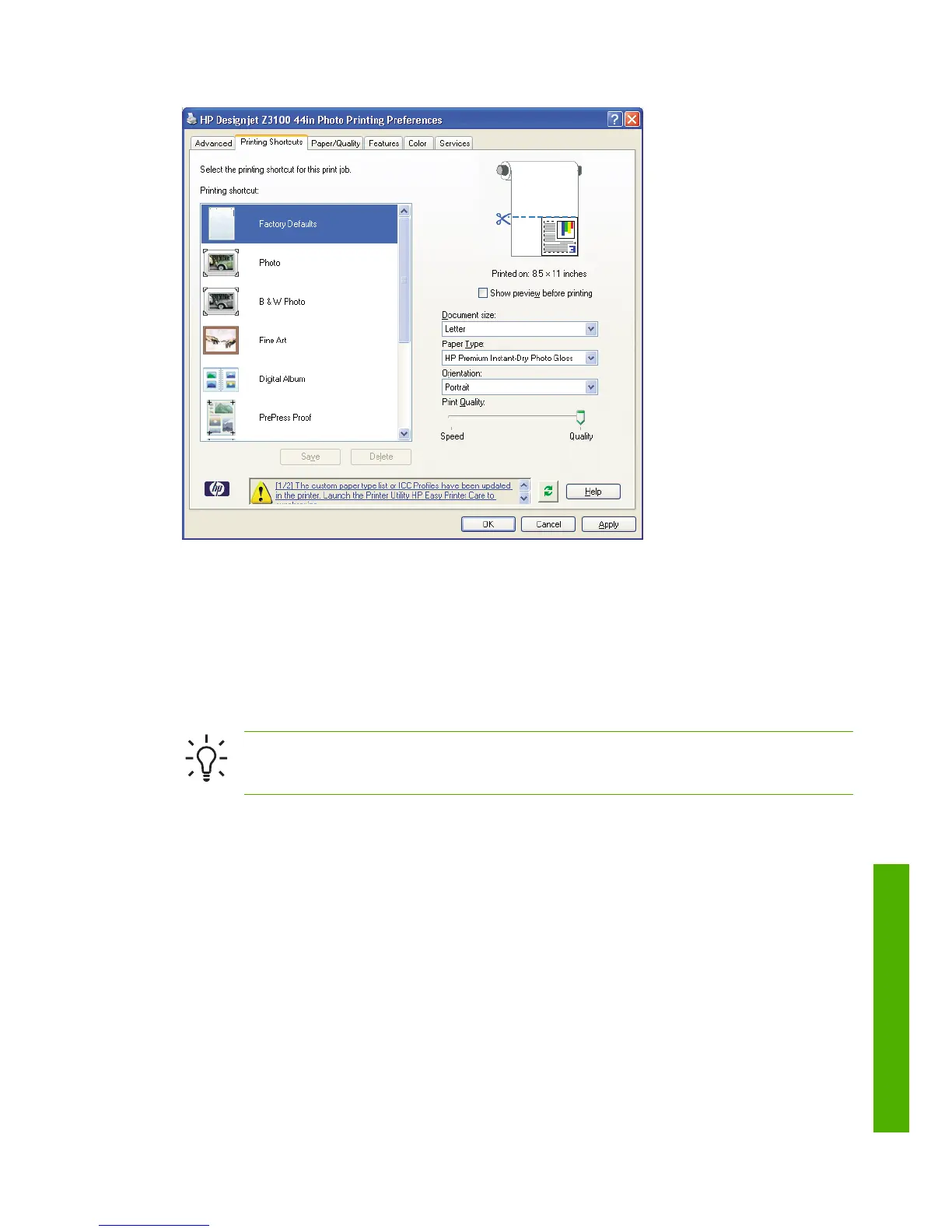 2. Change any value in the Printing Shortcuts tab and/or other tabs.