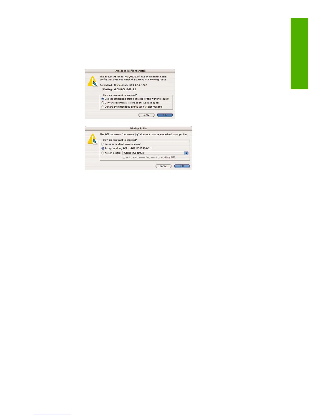 If the document has an embedded color profile that does not match the current working space,