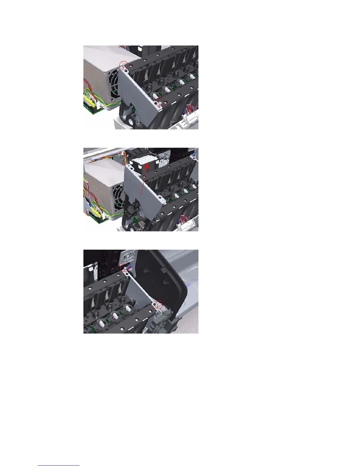 4. Remove two T-10 screws that secure the Right Side Plate of the Left Ink Supply Station.