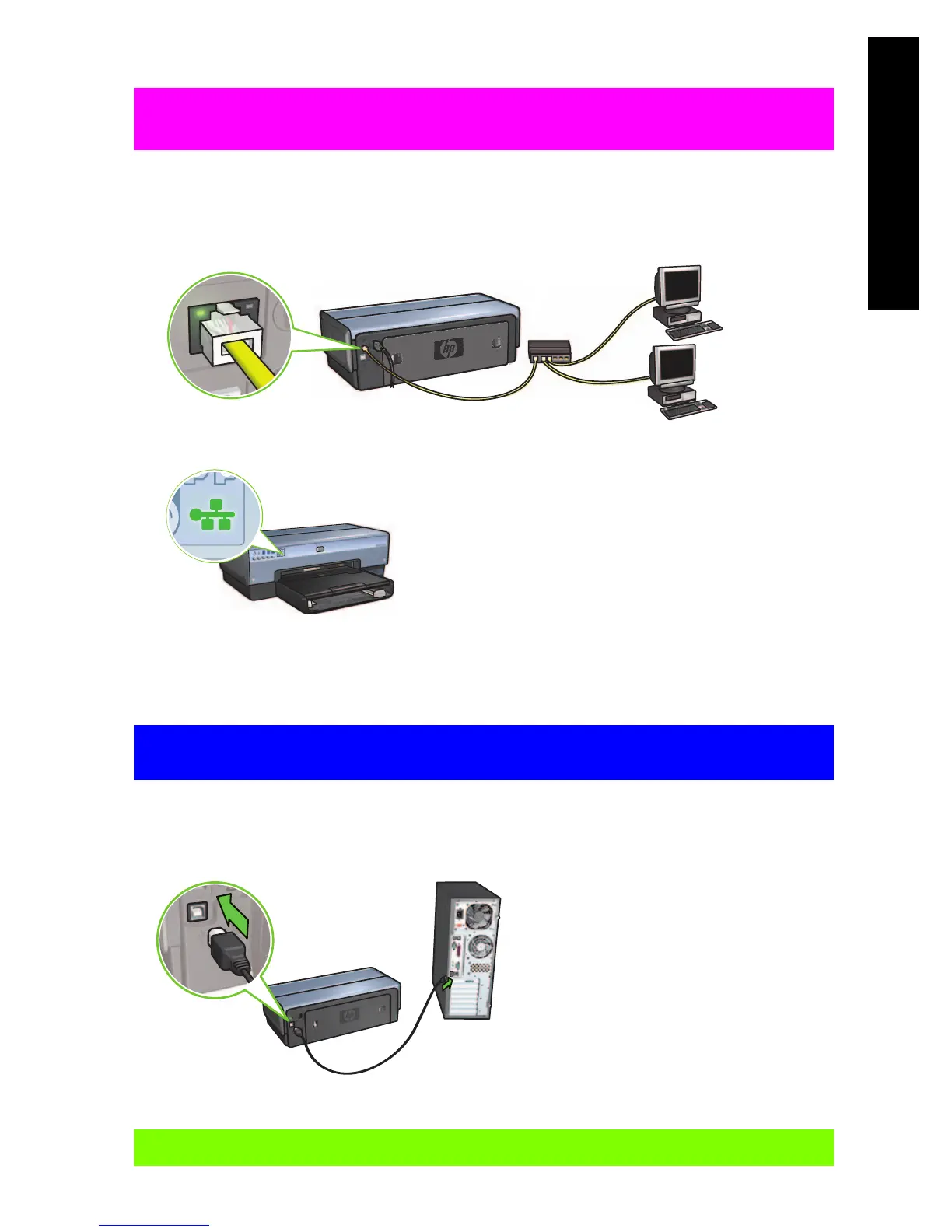 1. Use an Ethernet cable to connect the printer to the network hub, switch, or router.