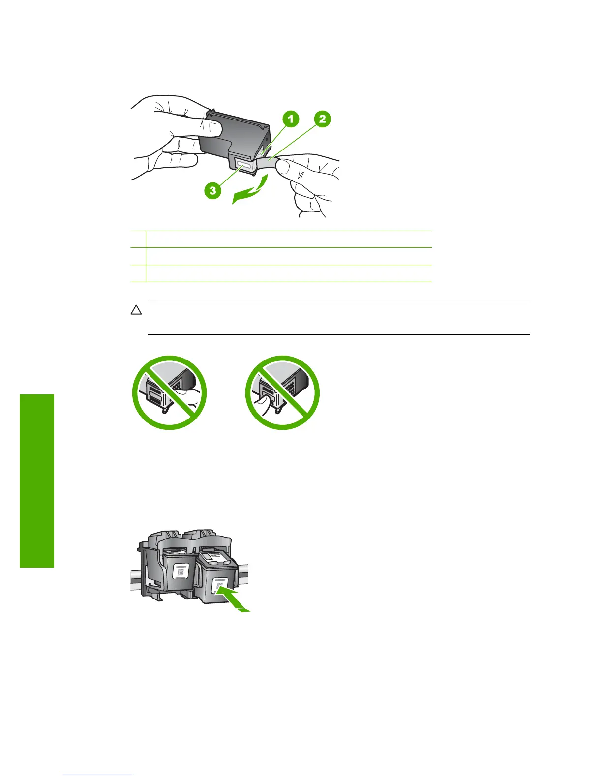 CAUTION: Do not touch the copper-colored contacts or ink nozzles. Touching