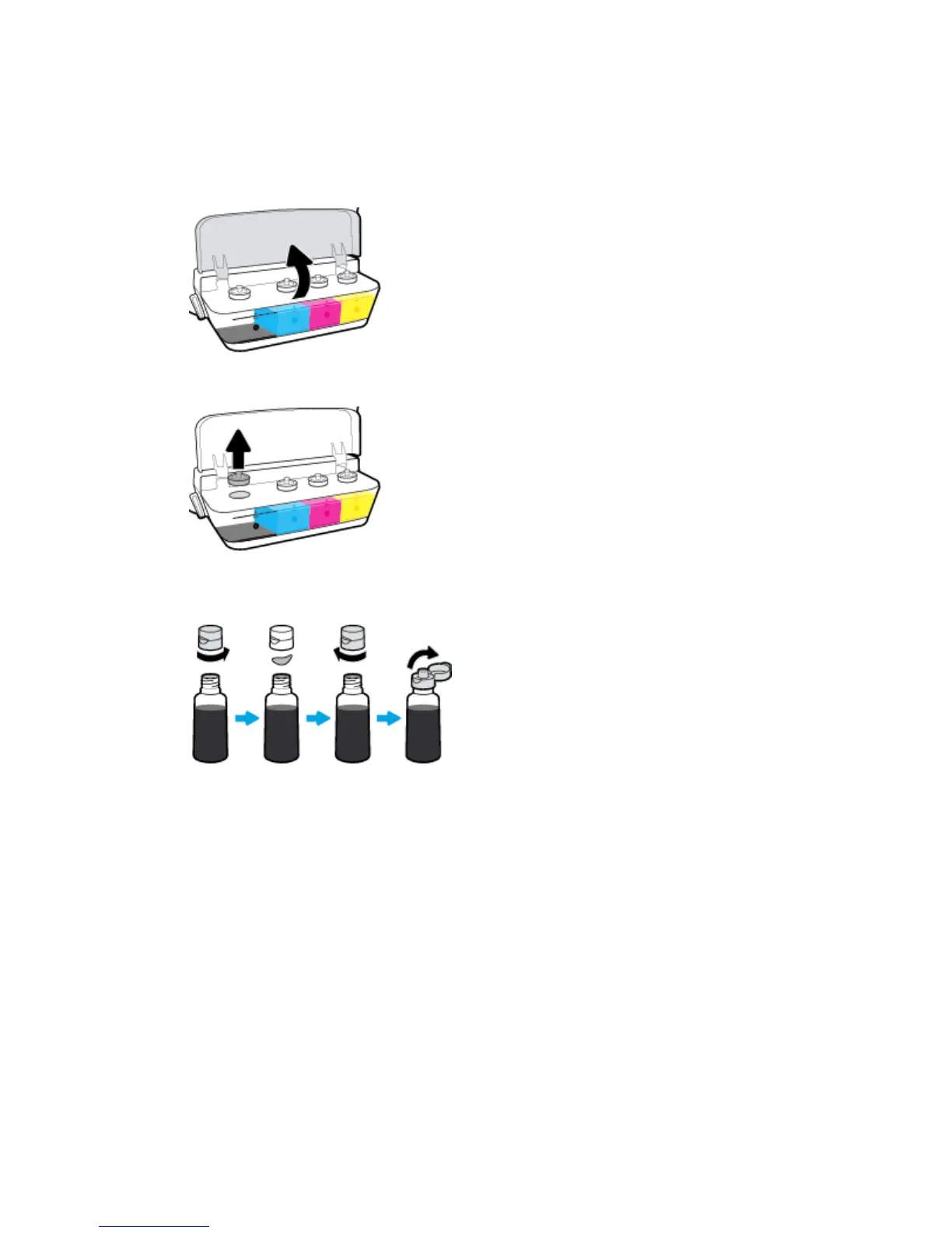 3. Twist to remove the cap of the ink bottle, remove the seal from the bottle, install the cap back onto the