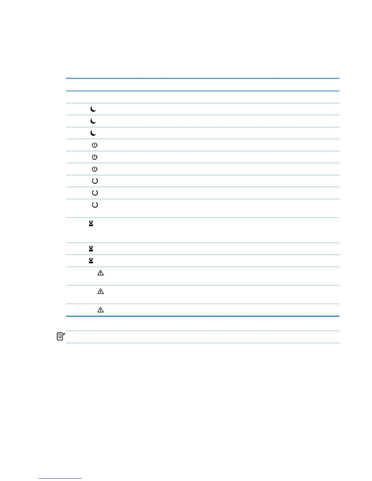 The product has six LEDs on the control panel that indicate product status. The table below explains