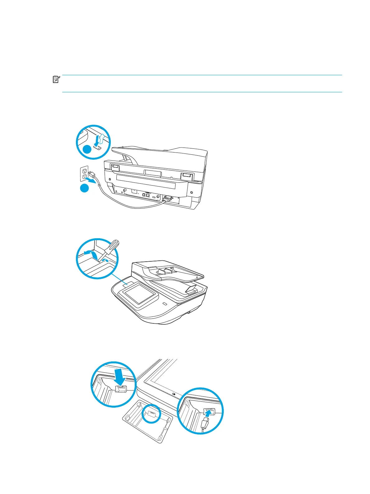 1. Press the Power button to turn o the product (1), and then disconnect the power cable (2).