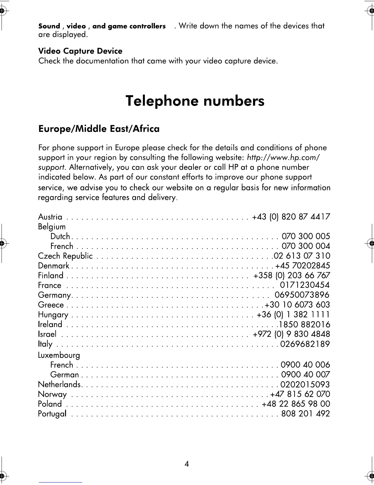 HP DVD Player - Telephone Numbers; Europe;Middle East;Africa