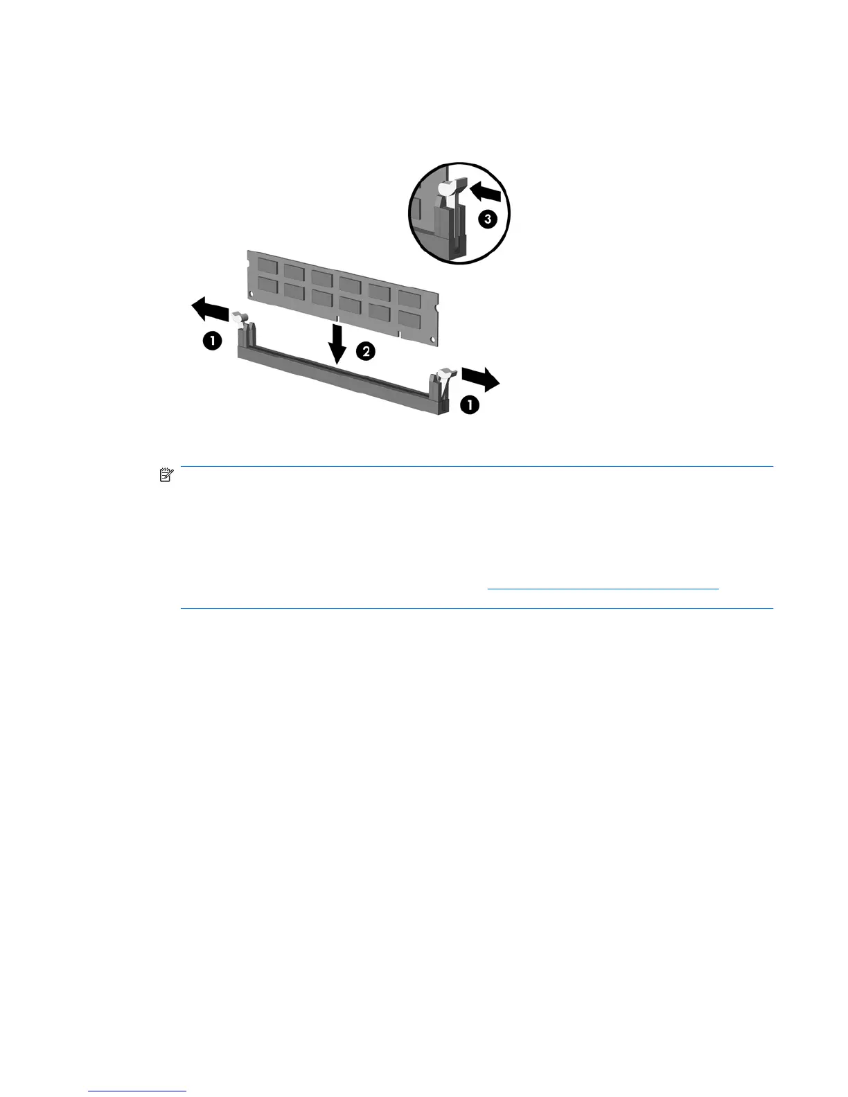 7. Open both latches of the memory module socket (1), and insert the memory module into the socket