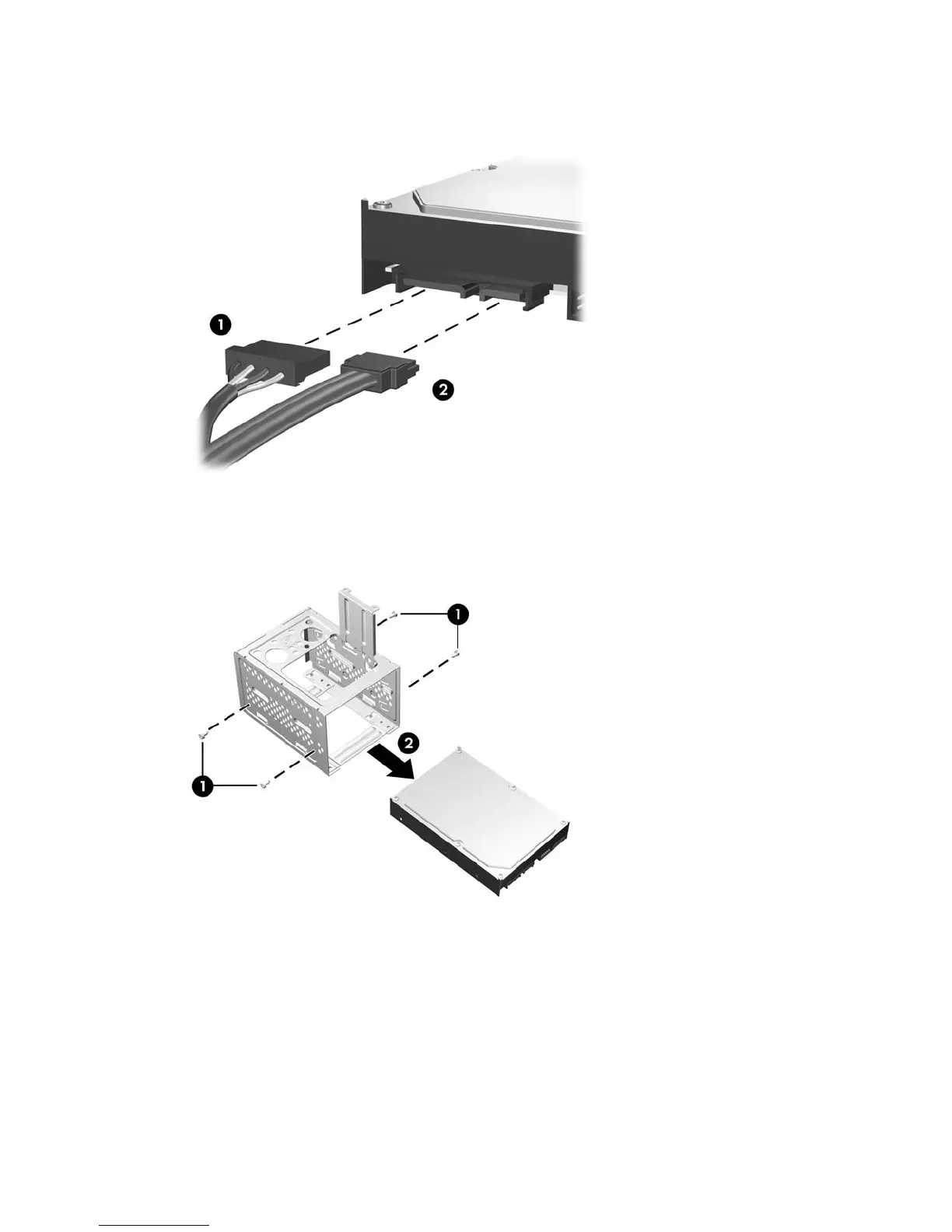 9. Disconnect the power cable (1) and data cable (2) from the back of the hard drive.