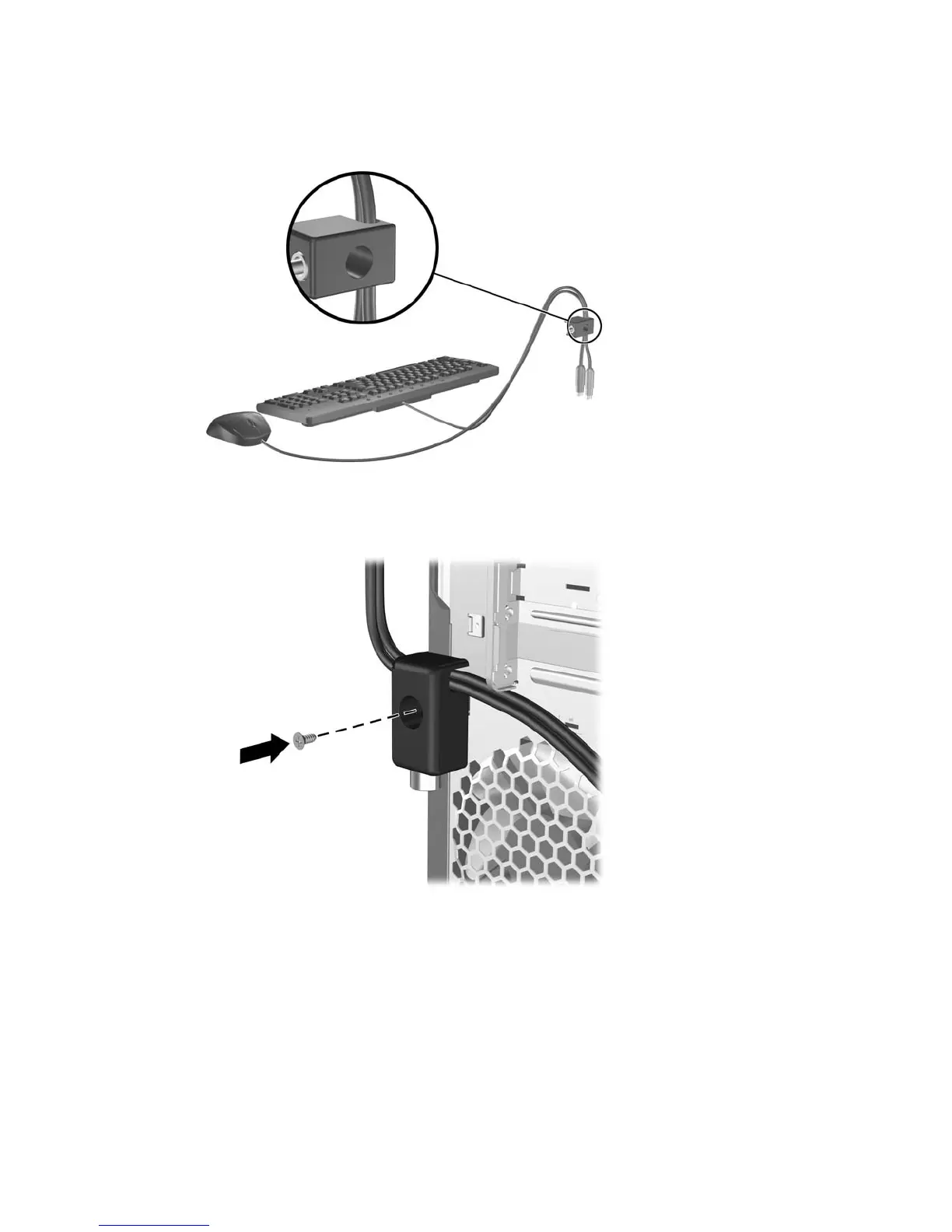 2. Thread the keyboard and mouse cables through the lock.