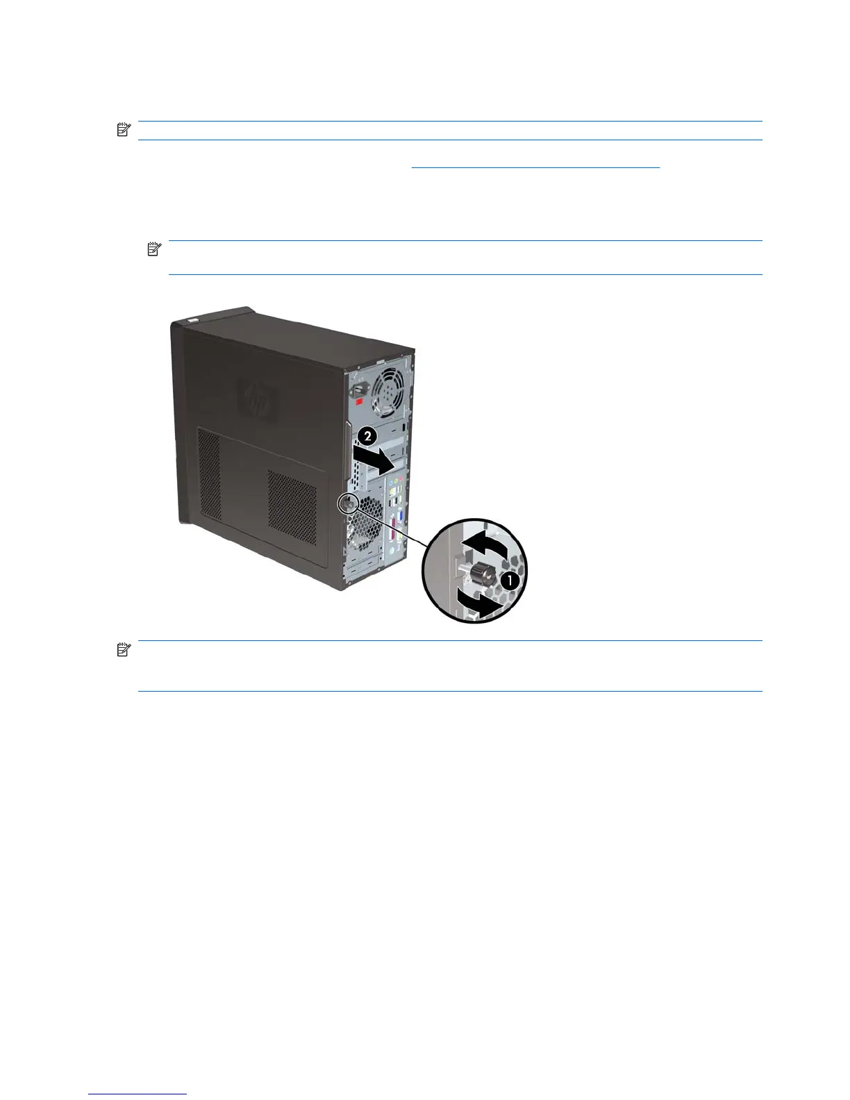 2. Loosen the captive thumbscrew (1) that secures the access panel to the computer chassis.