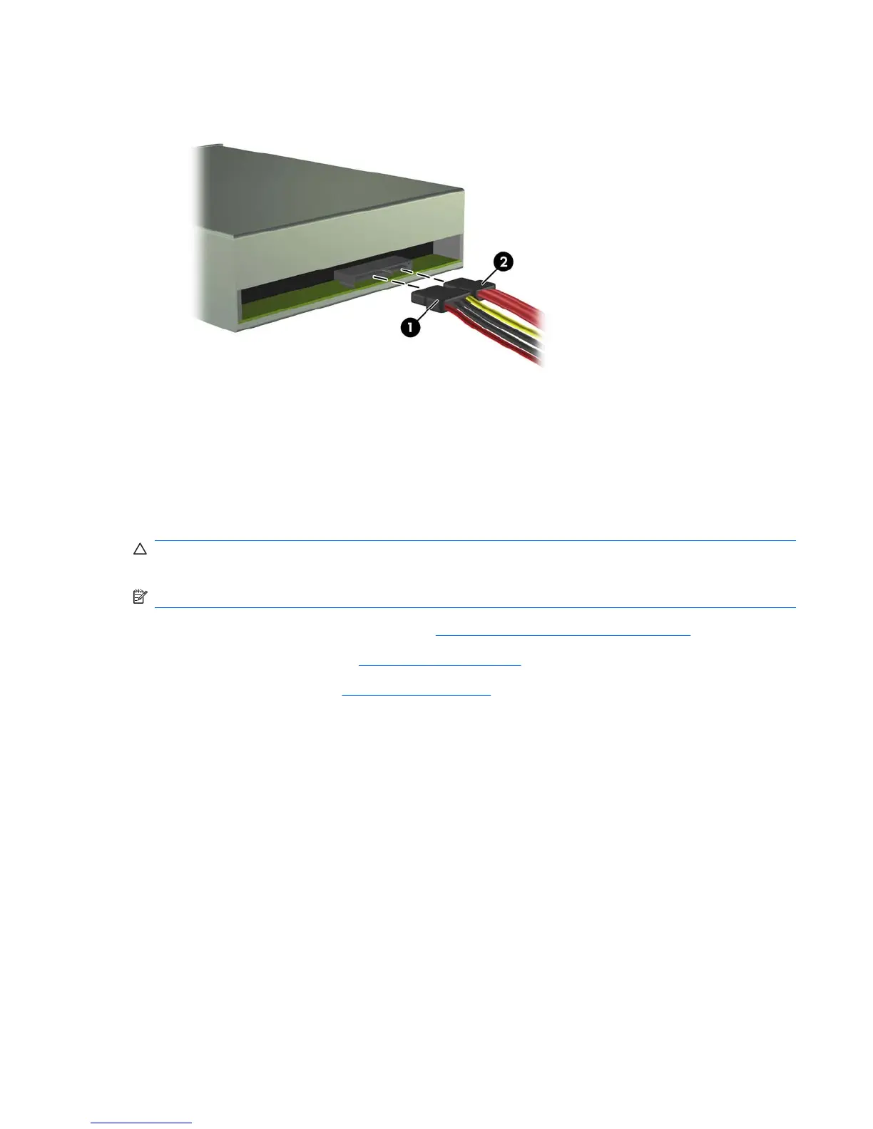 9. Connect the power cable (1) and data cable (2) to the rear of the optical drive.